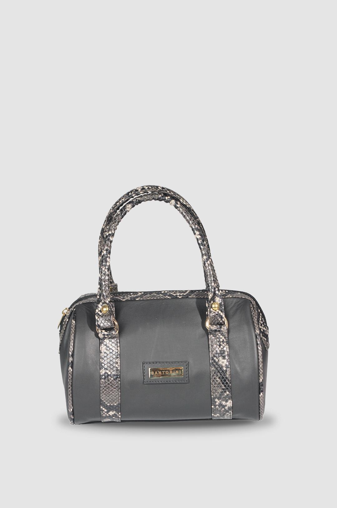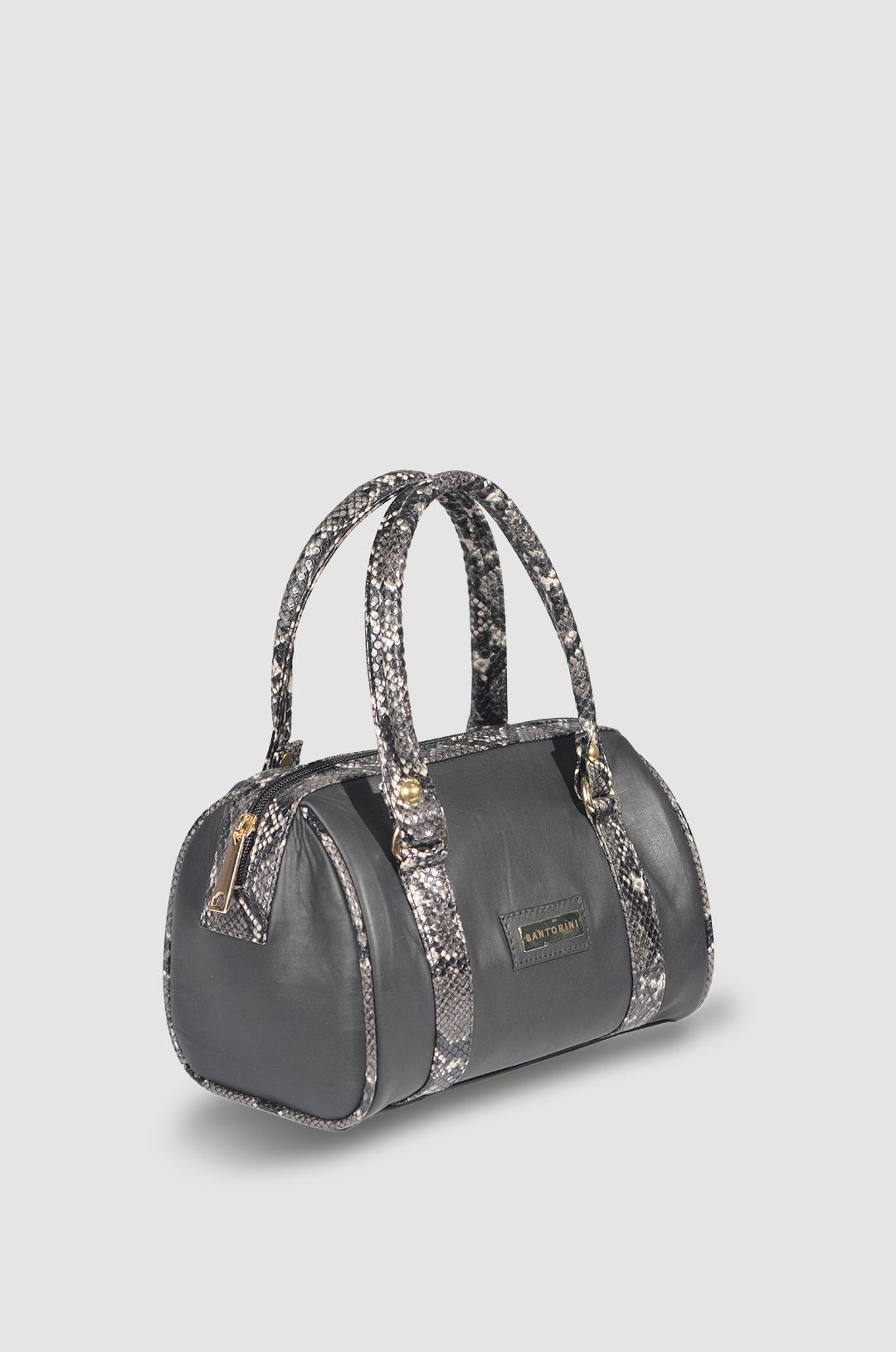Destaca con el estilo único del Bolso Cailin de Santorini. Fabricado en cuero de alta calidad, este bolso en color negro combina detalles en textura tipo reptil en asas y bordes, añadiendo un toque exótico y elegante. Su estructura tipo bowling ofrece amplio espacio interior, ideal para llevar tus esenciales con total comodidad. Incluye doble asa de mano y cierre con cremallera para mayor seguridad.