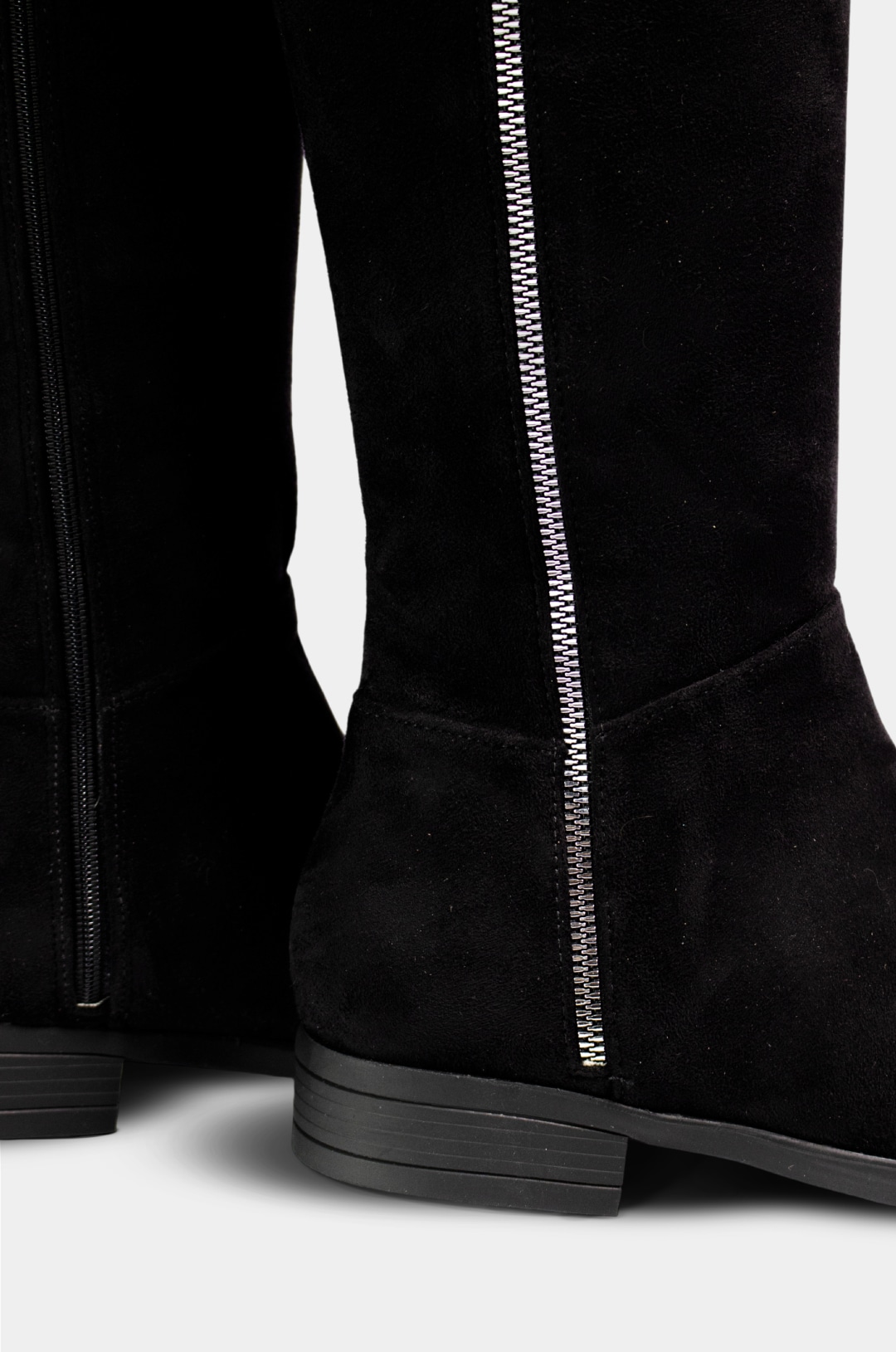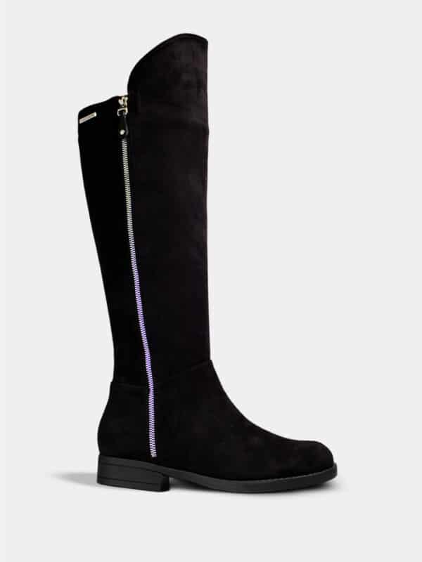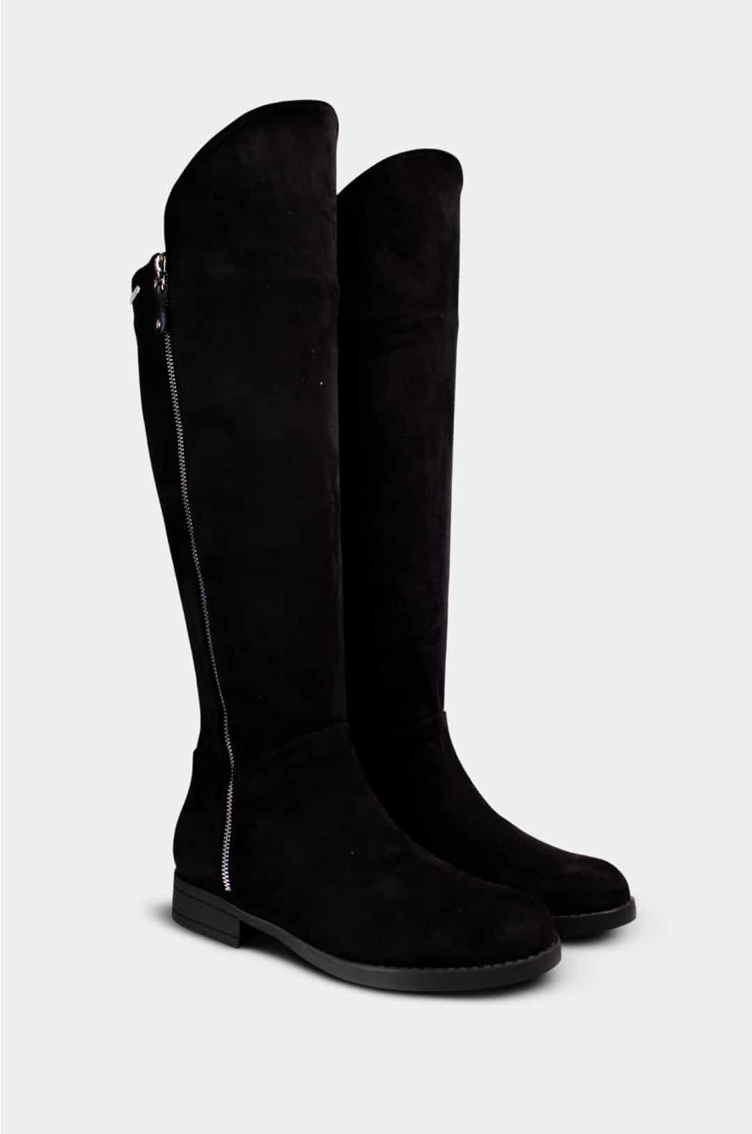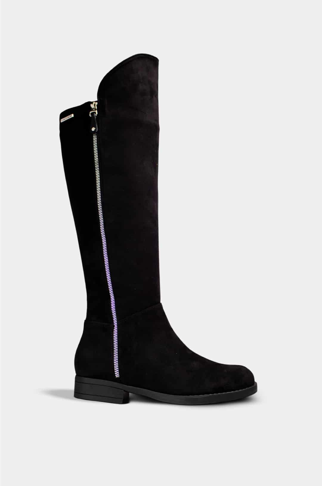 Bota alta para mujer marca Santorini, elaborada en antelina negra de textura suave y elegante. Su diseño estilizado llega justo debajo de la rodilla, ofreciendo una apariencia moderna y versátil para el día a día o looks más formales.