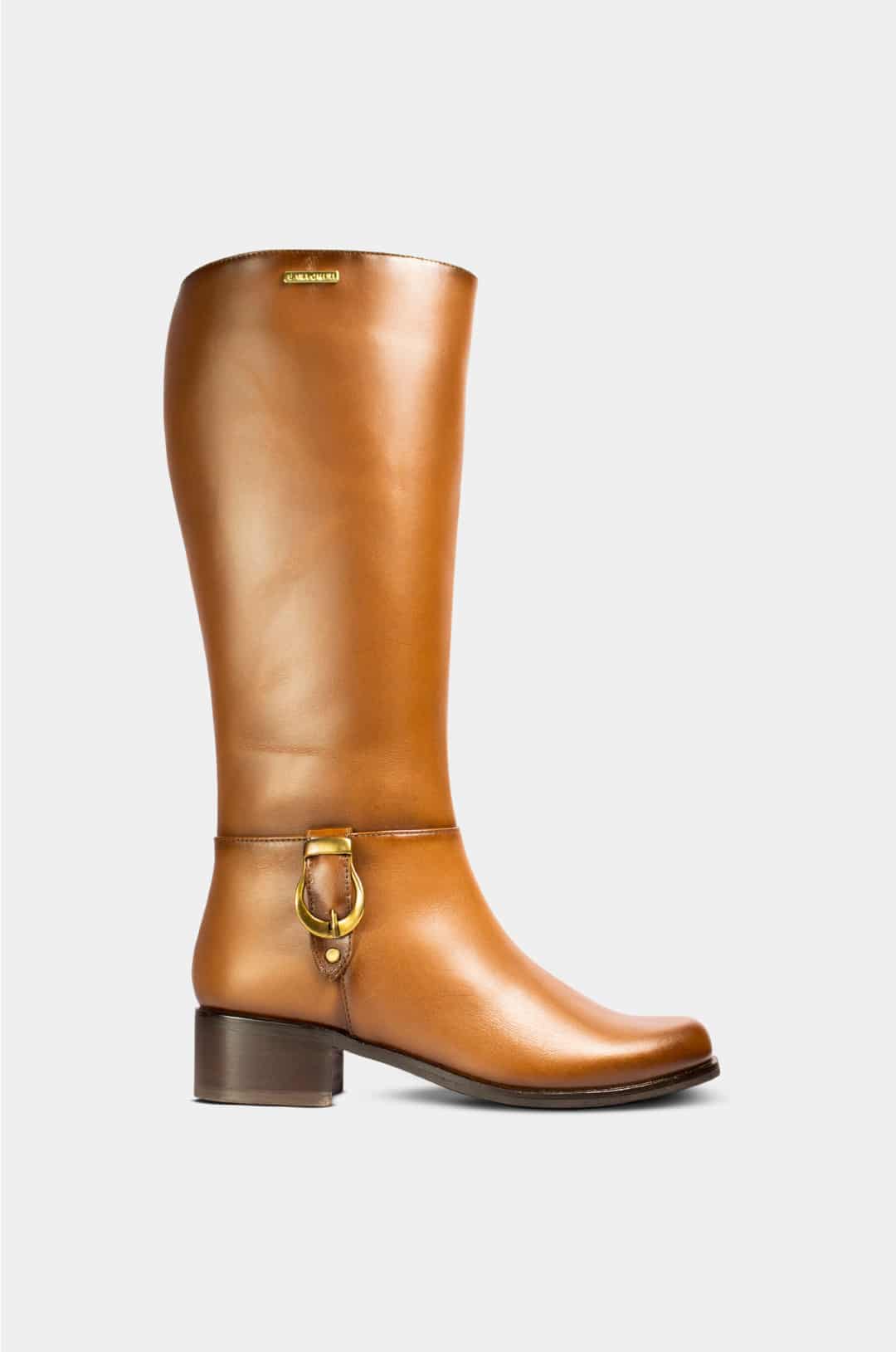 Bota marca Santorini elaborada en cuero color miel, con diseño clásico y elegante, ideal para looks casuales o elegantes .cuenta con una hebilla dorada en el costado inferior, que le aporta un toque decorativo tipo ecuestre. Tacón bajo y cuadrado, de aproximadamente 2 a 3 cm de altura, ideal para uso diario. En conjunto, es una bota elegante, versátil y muy práctica, perfecta para combinar con jeans, leggings o vestidos de invierno.