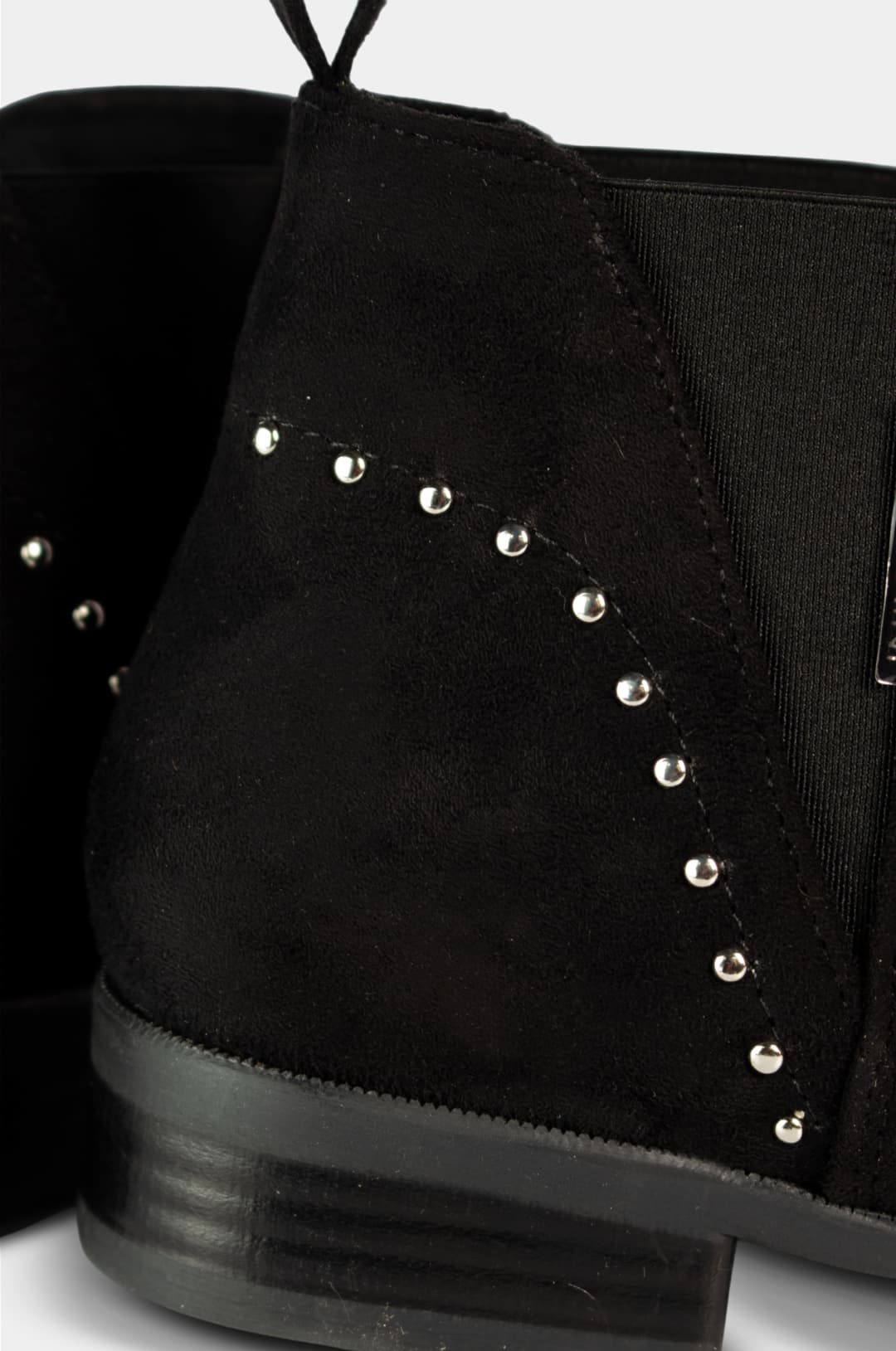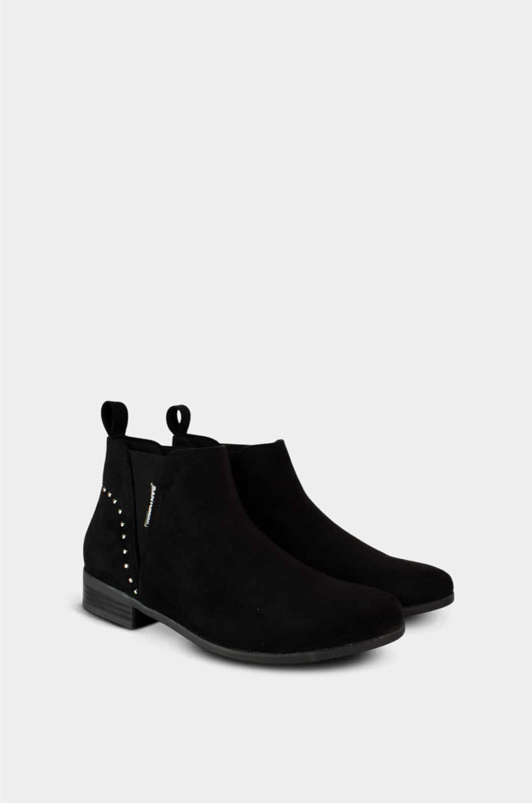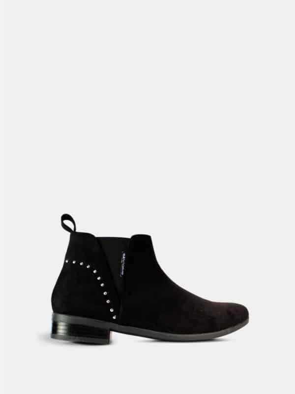Estos botines negros son una opción sofisticada y versátil para quienes buscan un calzado cómodo sin renunciar al estilo. Confeccionados en material tipo gamuza, destacan por su textura suave y su diseño minimalista realzado con delicados detalles metálicos laterales. Su silueta limpia y tacón bajo los convierte en un básico funcional, ideal para el uso diario y para complementar looks modernos con un toque elegante.