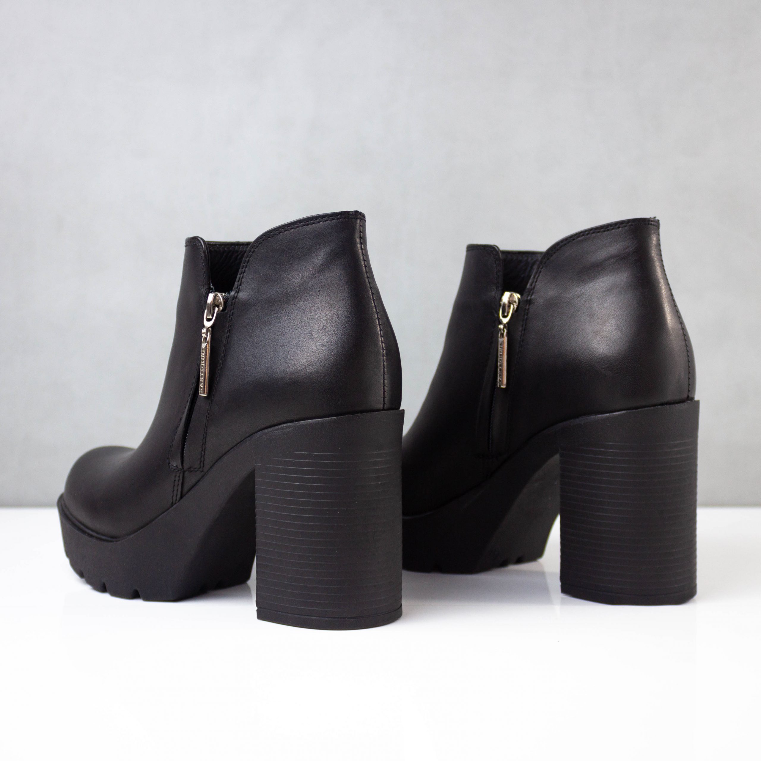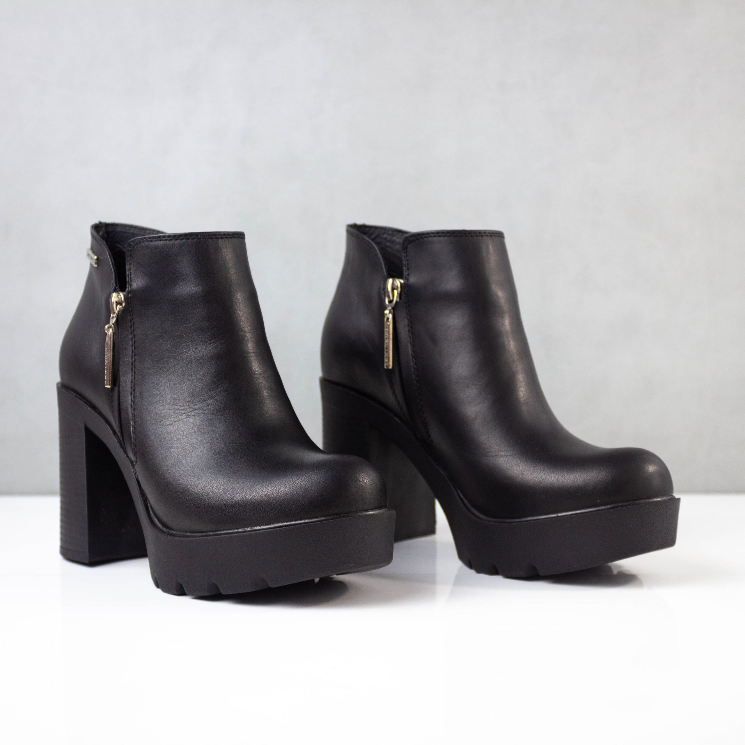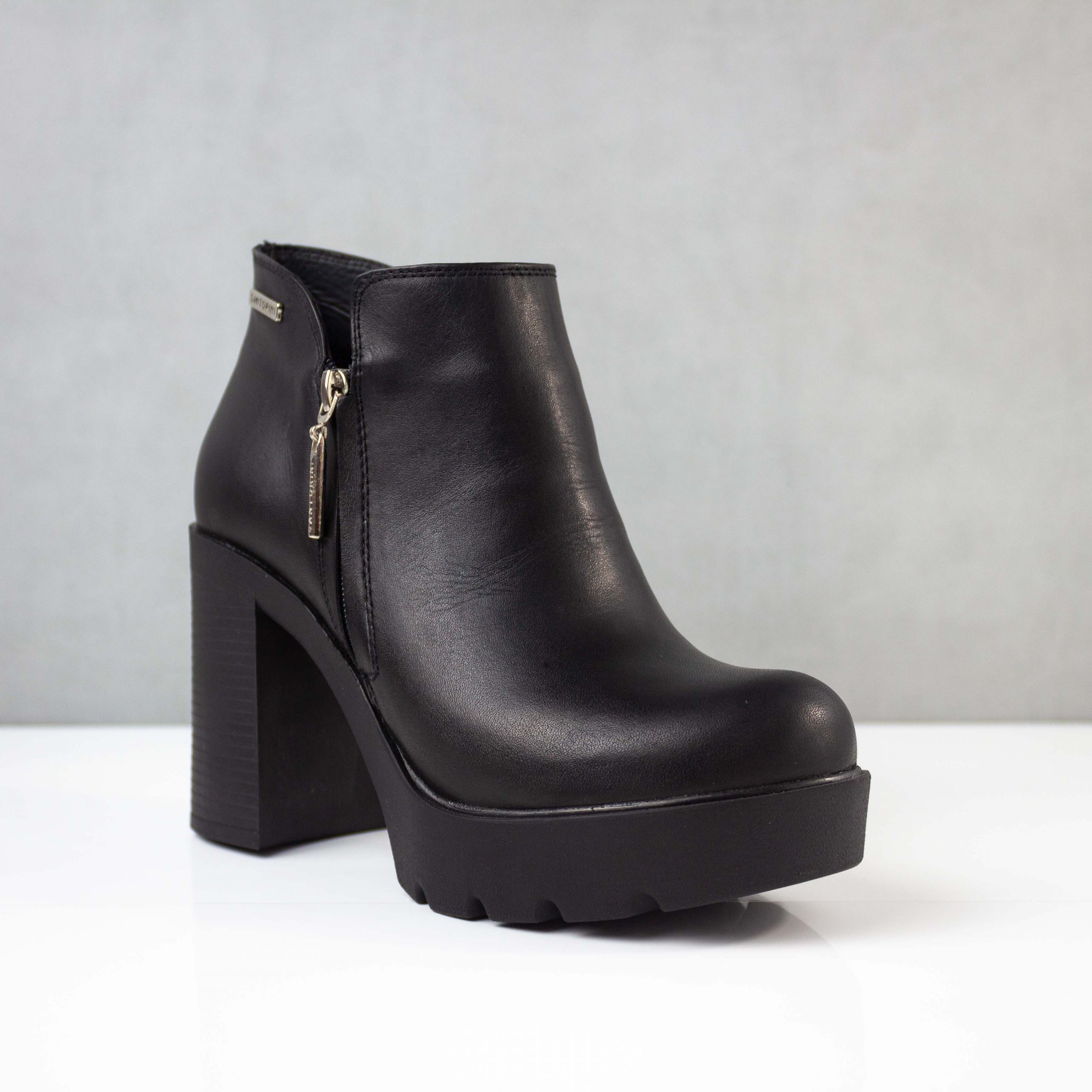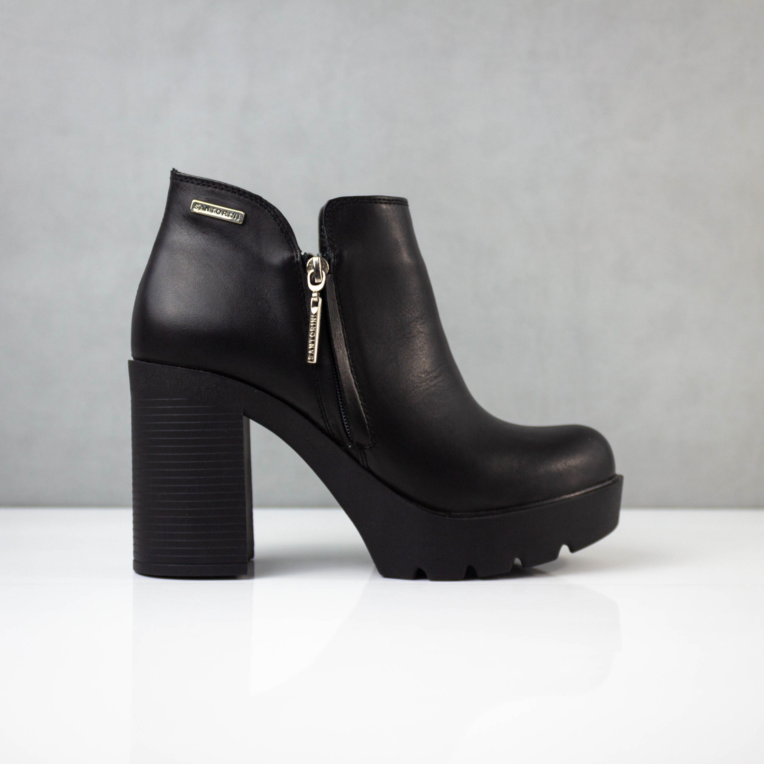 Este botín marca Santorini está elaborado en cuero negro, con un diseño moderno y sofisticado que resalta por su plataforma robusta y su tacón alto cuadrado, brindando altura y estabilidad. Cuenta con cierres laterales metálicos en tono dorado que facilitan el calce y aportan un toque elegante. Su punta redondeada y la suela antideslizante con diseño dentado garantizan comodidad y seguridad al caminar. Un modelo ideal para complementar looks urbanos o de noche con un estilo audaz y femenino.