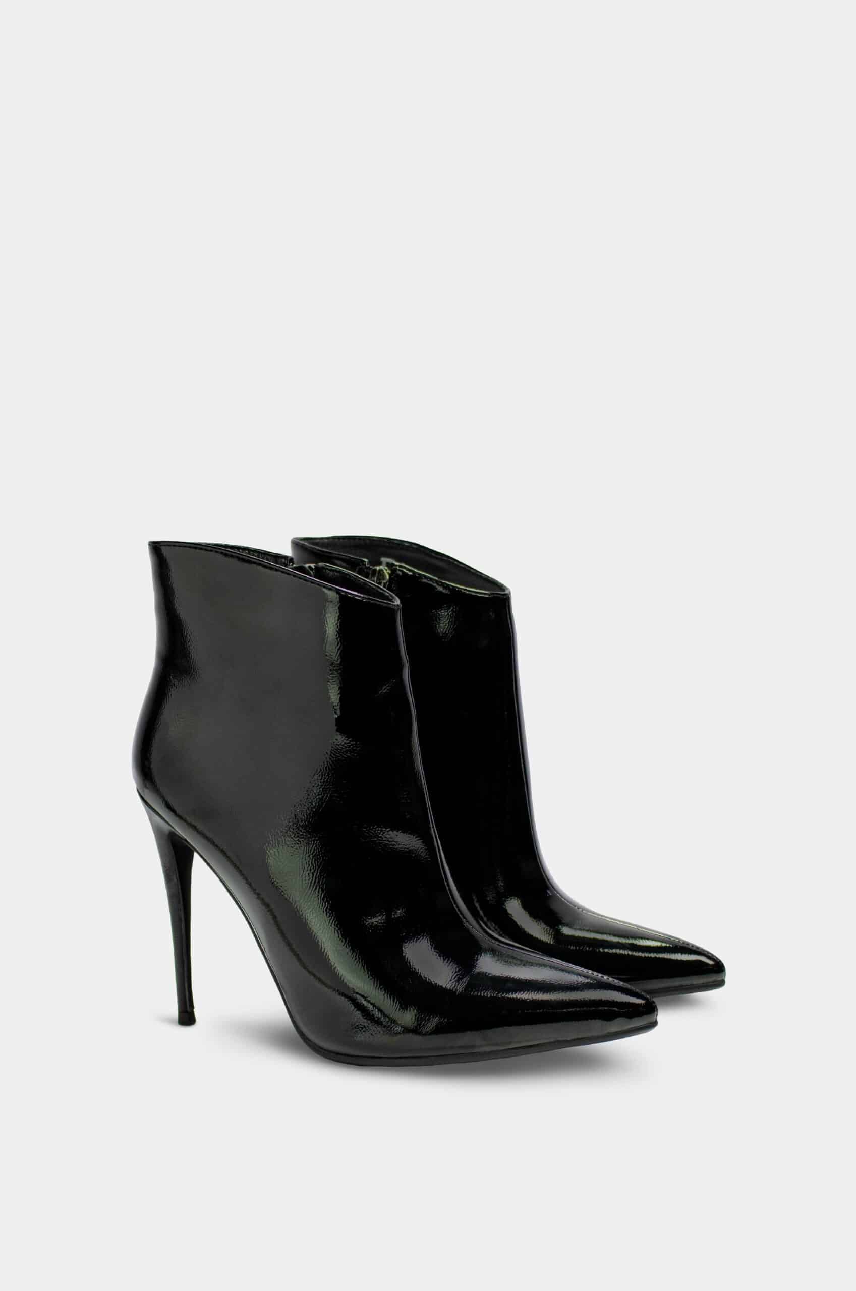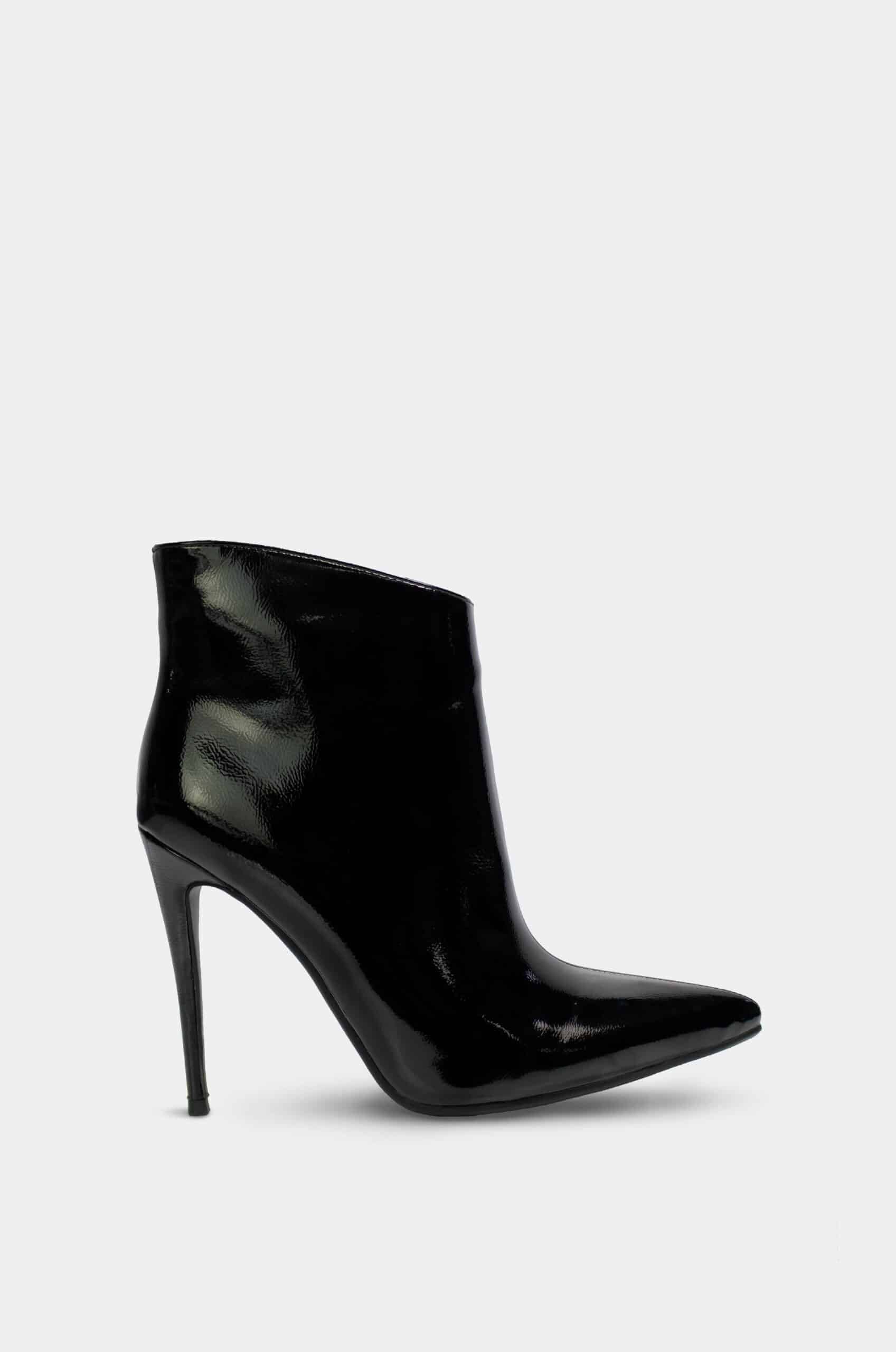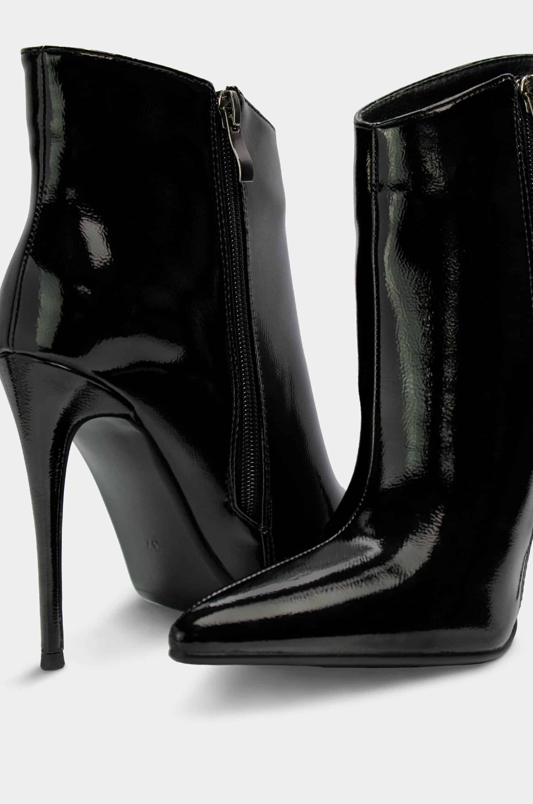 Botín en charol negro, con un acabado brillante que realza su estilo sofisticado. Presenta un tacón tipo puntilla de 9.5 centímetros, estilizado y femenino, que aporta altura y un look más elegante. Su diseño es puntudo en la parte frontal, lo que alarga visualmente el pie y añade un toque moderno y estilizado. Un modelo ideal para looks de noche, eventos o para quienes buscan un botín impactante y lleno de actitud.