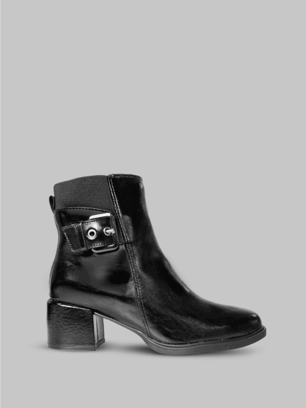 Este botín de la marca Bottero está elaborado en cuero negro de acabado brillante, ideal para un look sofisticado y versátil. Su diseño de caña media incorpora un cierre lateral con cremallera que facilita el calce y un detalle de correa decorativa con hebilla metálica en la parte superior, que aporta un toque moderno y elegante.