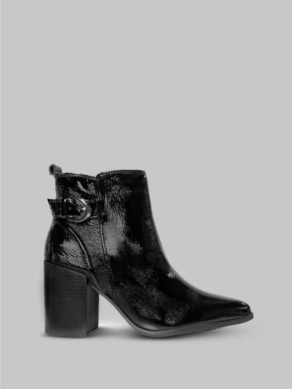 Este botín marca Bottero en cuero negro presenta un diseño sofisticado y moderno. Está elaborado en cuero con acabado charolado de alto brillo, lo que le aporta un toque elegante y llamativo. Su silueta es estilizada con punta fina, ideal para alargar la figura.