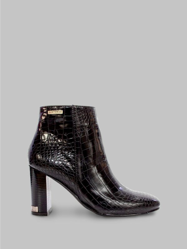 Este botín marca Santorini está elaborado en material sintético con acabado tipo charol en diseño grabado con estilo cocodrilo, lo que le da un toque sofisticado y elegante. Su color negro brillante lo convierte en un calzado versátil, ideal para combinar con looks formales o casuales.