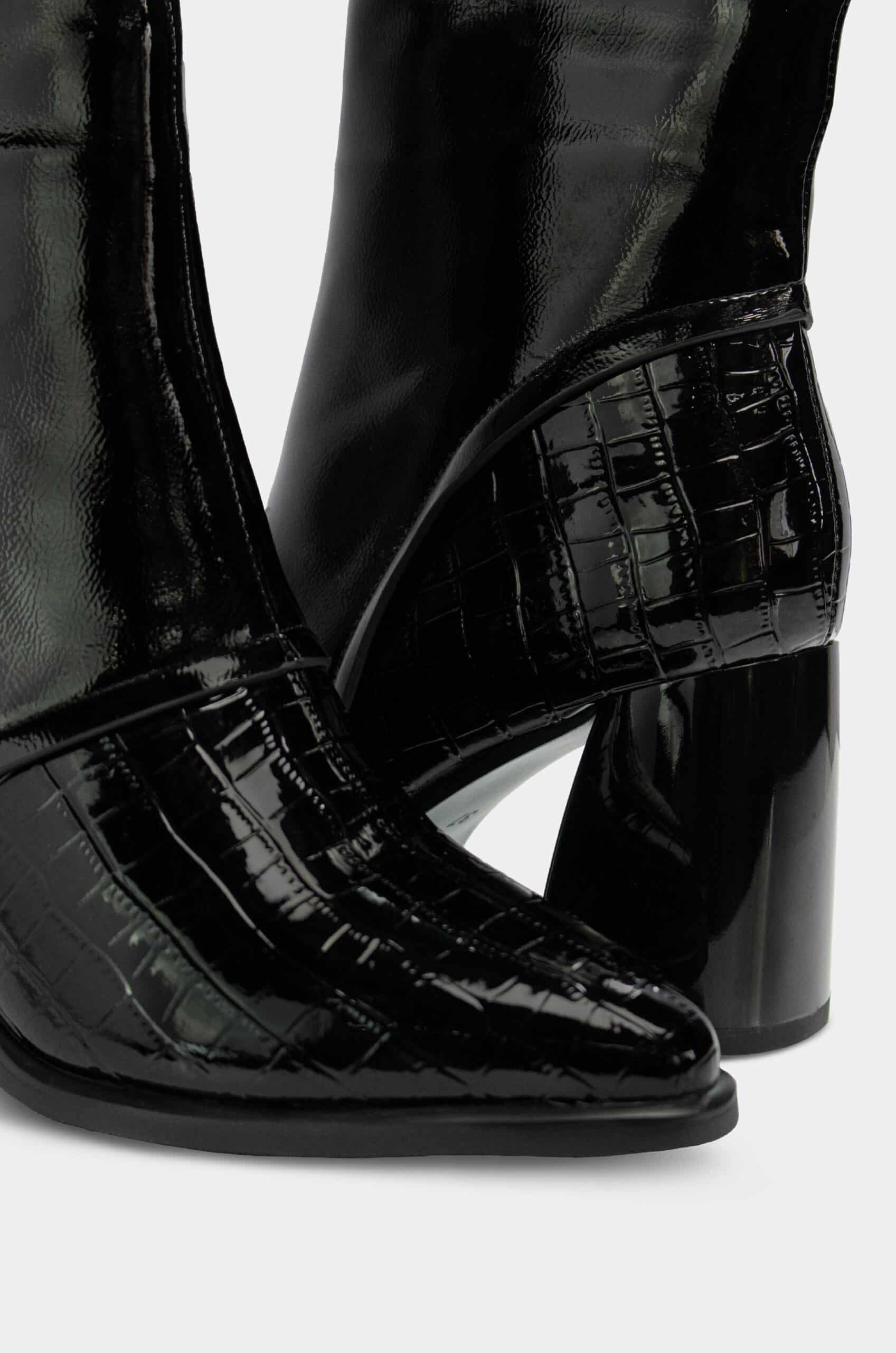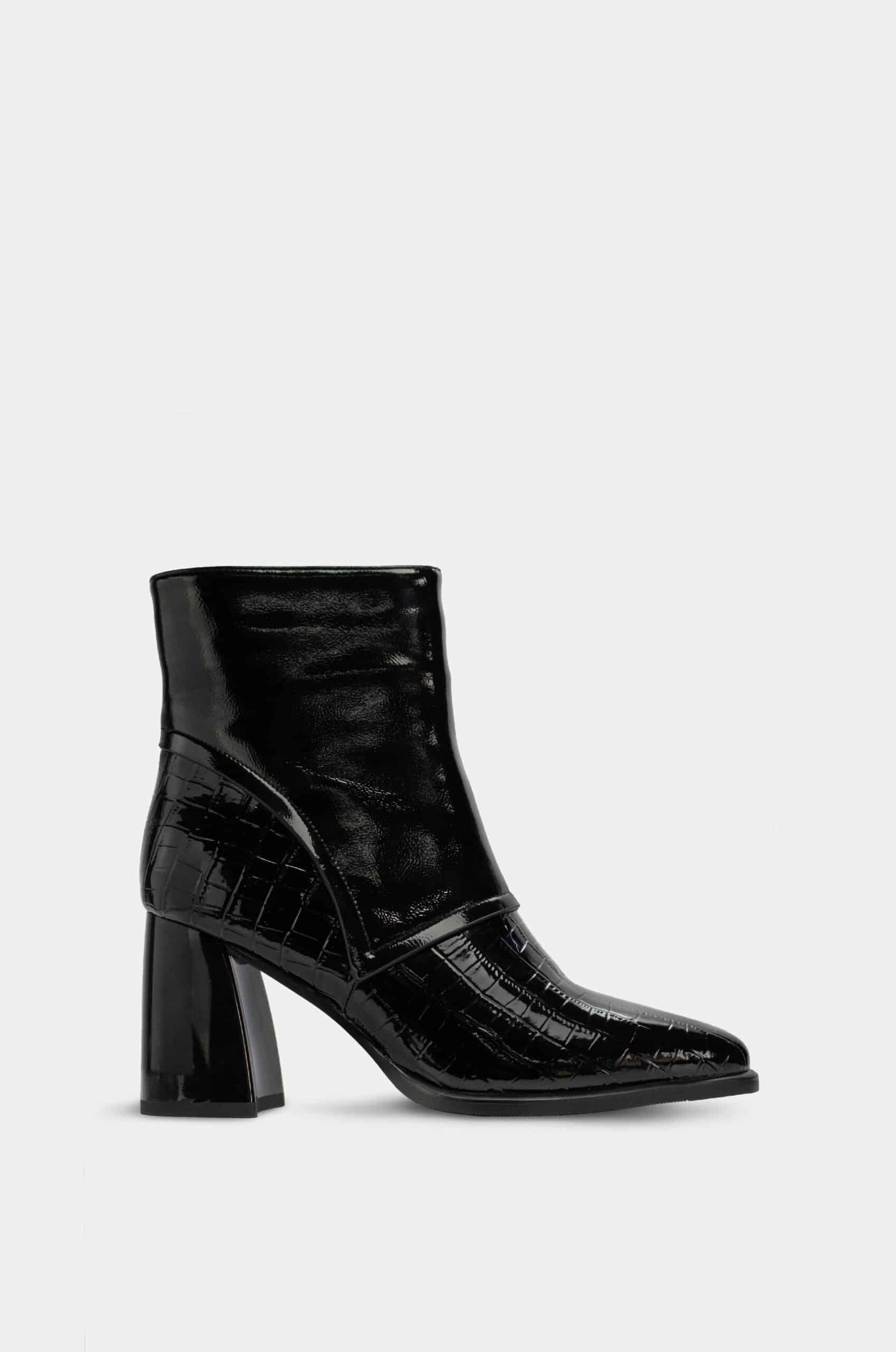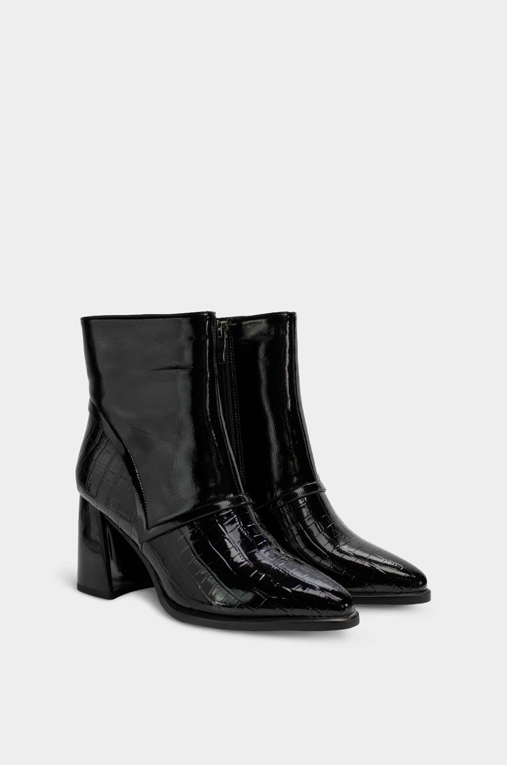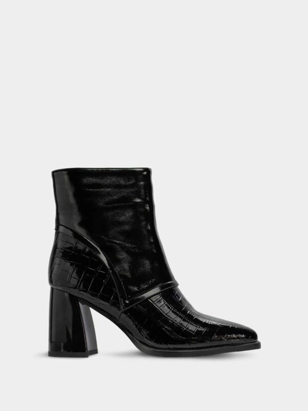 Botín en charol negro marca Santorini, elaborado en material sintético con acabado estilo cocodrilo, que aporta textura, brillo y un look lujoso. Su diseño incorpora un tacón ancho de 7.5 cm, estable y cómodo, ideal para usar durante largos periodos sin perder elegancia. El estilo en charol con efecto cocodrilo le da un aire moderno y sofisticado, perfecto para elevar cualquier outfit con un toque distintivo y fashion.