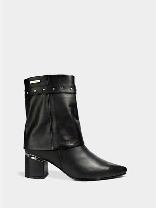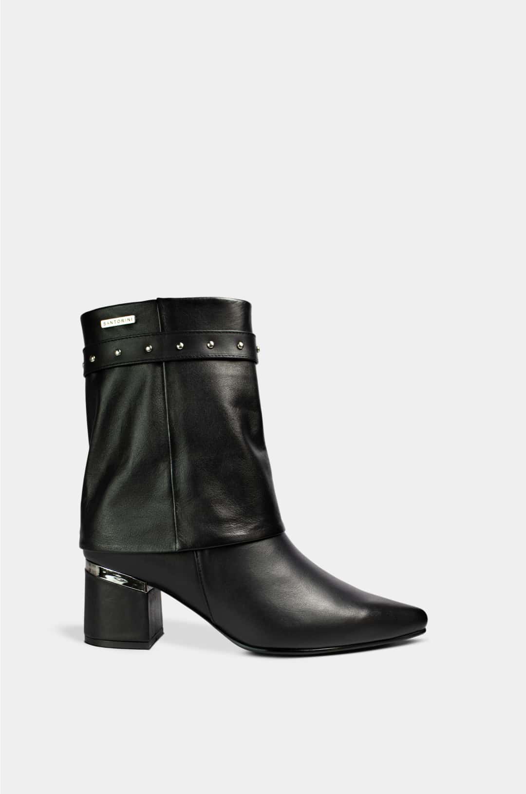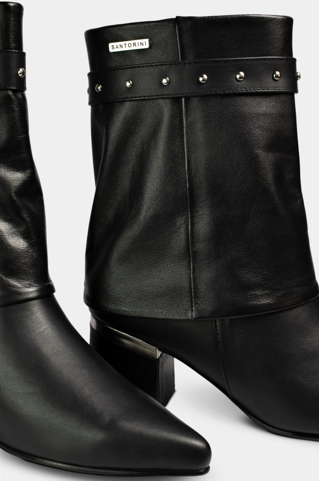 Este elegante botín Santorini está elaborado en cuero negro de acabado suave, ofreciendo un look refinado y versátil. Su diseño destaca por una caña tipo media y unos taches plateados en la parte superior, ajustada y flexible, que brinda un efecto estilizado en la pierna y un calce cómodo. Presenta una punta delicadamente estructurada y una suela delgada y elegante, ideal para un estilo moderno y minimalista.