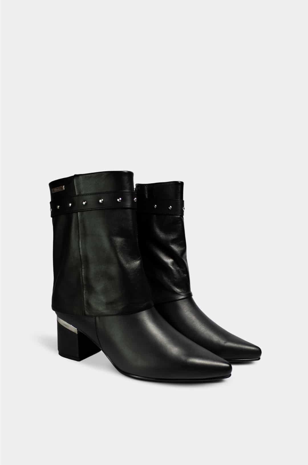 Este elegante botín Santorini está elaborado en cuero negro de acabado suave, ofreciendo un look refinado y versátil. Su diseño destaca por una caña tipo media y unos taches plateados en la parte superior, ajustada y flexible, que brinda un efecto estilizado en la pierna y un calce cómodo. Presenta una punta delicadamente estructurada y una suela delgada y elegante, ideal para un estilo moderno y minimalista.