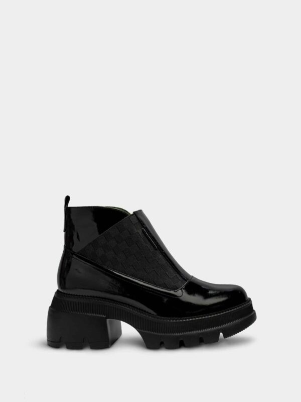 Un botín Santorini elaborado en cuero brillante, que destaca por su acabado pulido y moderno. Presenta una punta redondeada y un diseño limpio que aporta elegancia sin perder comodidad. Su estructura robusta se complementa con una suela ancha de 5.5 cm de altura, que brinda estabilidad, estilo y una elevación perfecta para uso diario. Un botín sofisticado, versátil y contemporáneo, ideal para complementar cualquier look con un toque refinado.