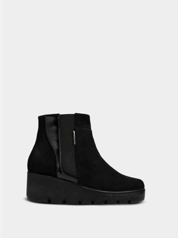 Este botín marca Santorini está elaborado en cuero carnaza color negro de textura suave y acabado elegante, aportando un toque moderno y sofisticado al look. Su diseño incorpora una suela corrida dentada, robusta y cómoda, que brinda mayor estabilidad y un estilo urbano contemporáneo. La silueta es cómoda y funcional, con punta redondeada y terminaciones limpias que realzan su estética.