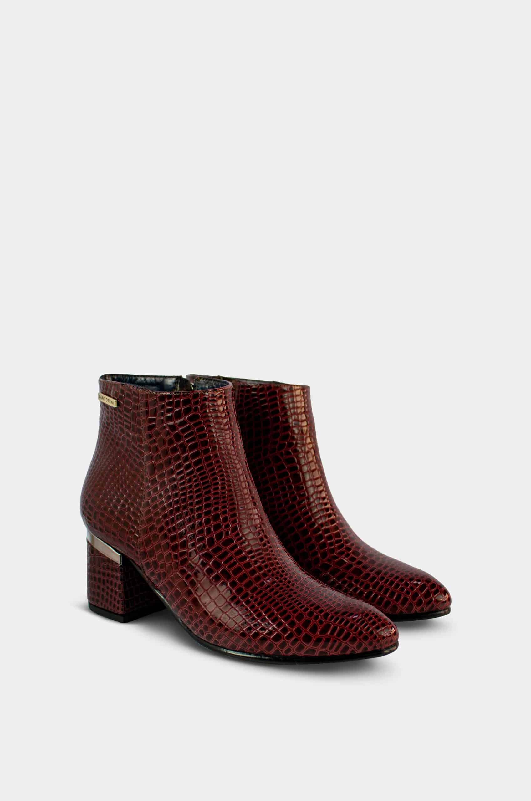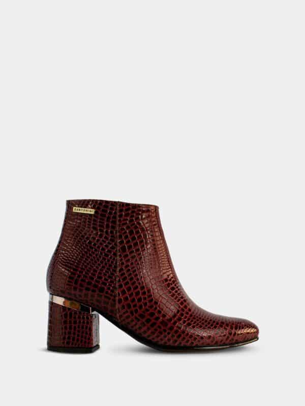 La caña es de altura media y presenta una pequeña placa con el nombre de la marca Santorini en la parte lateral superior. Es un botín ideal para combinar con pantalones ajustados, faldas o vestidos, perfecto para un look moderno con un toque refinado.