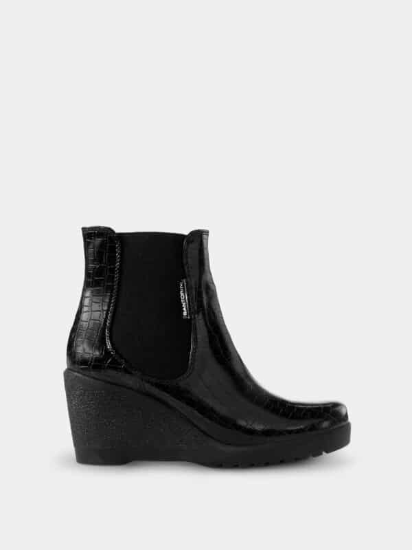 Botín marca SANTORINI elaborado en charol negro con acabado brillante y textura tipo reptil que aporta un estilo elegante y moderno. Su diseño al tobillo incorpora paneles laterales elásticos que facilitan el calce y brindan mayor comodidad y ajuste.