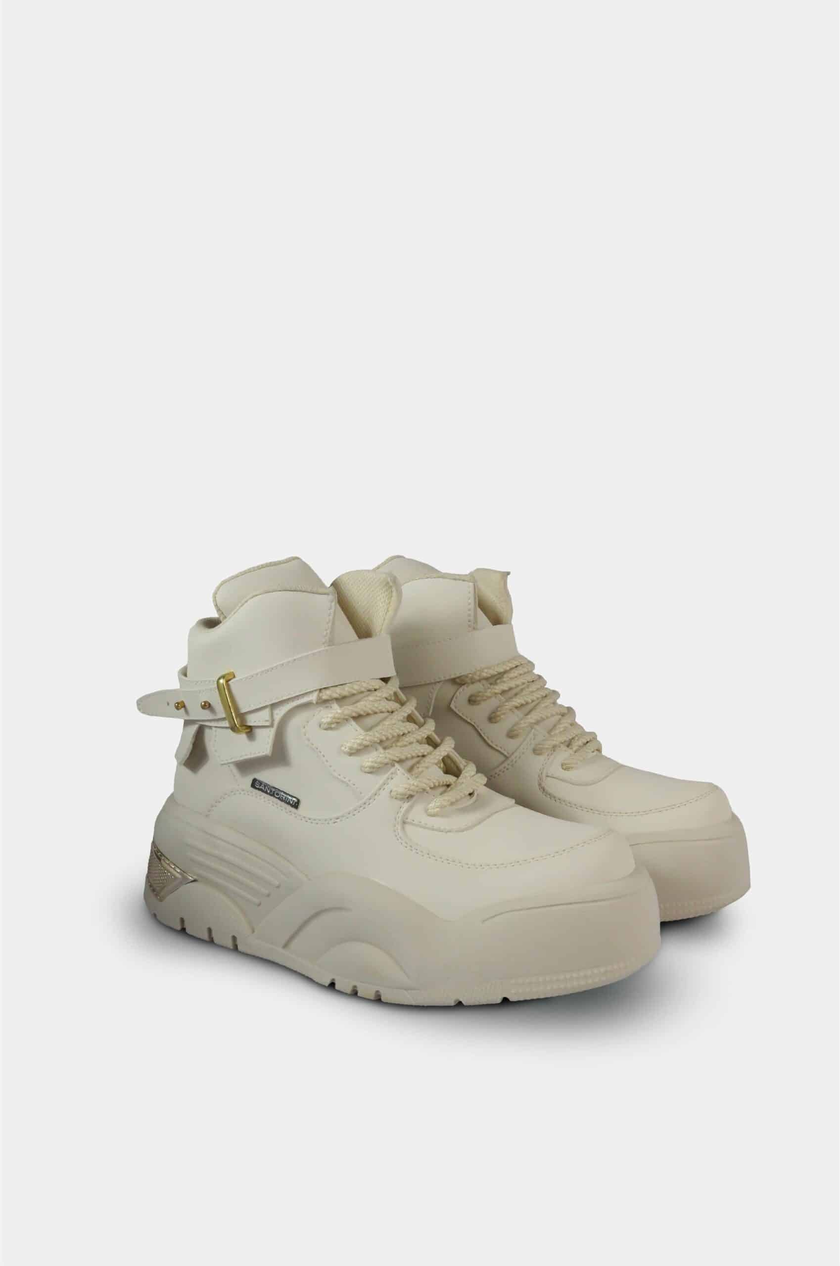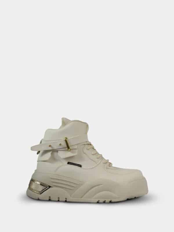 Cuenta con cierre de cordones en el empeine y una correa decorativa con hebilla metálica dorada alrededor de la caña, que añade un toque sofisticado y diferenciador. En el lateral incorpora placa con el nombre de la marca, reforzando su identidad.
