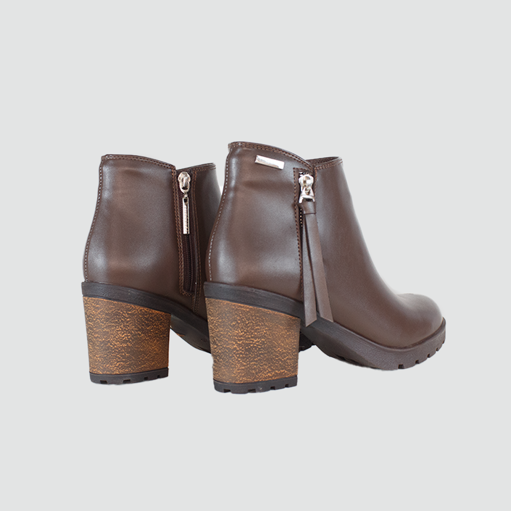 Este botín marca Santorini está elaborado en material sintético color café, con un acabado liso y elegante que resalta su diseño clásico. Cuenta con cremallera lateral metálica que facilita el calce y aporta un toque moderno. Su tacón cuadrado de altura media presenta un detalle texturizado que añade estilo, mientras que la suela con relieve antideslizante brinda comodidad y seguridad al caminar. Un modelo versátil y sofisticado, ideal para complementar atuendos casuales o de vestir con un aire femenino y contemporáneo.