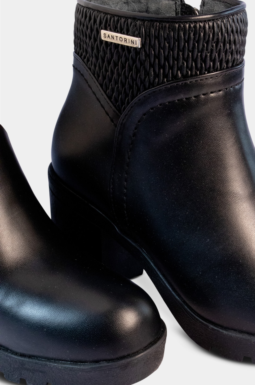 En la parte superior de la caña incorpora un detalle texturizado tipo tejido trenzado, que contrasta con el cuerpo liso del botín y le añade un toque distintivo y moderno. Además, incluye una pequeña placa metálica con el nombre Santorini en la parte frontal de la caña, resaltando la marca de forma sutil.
