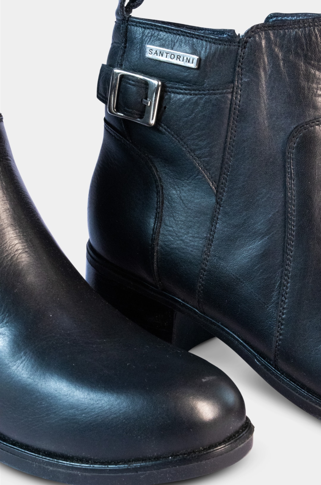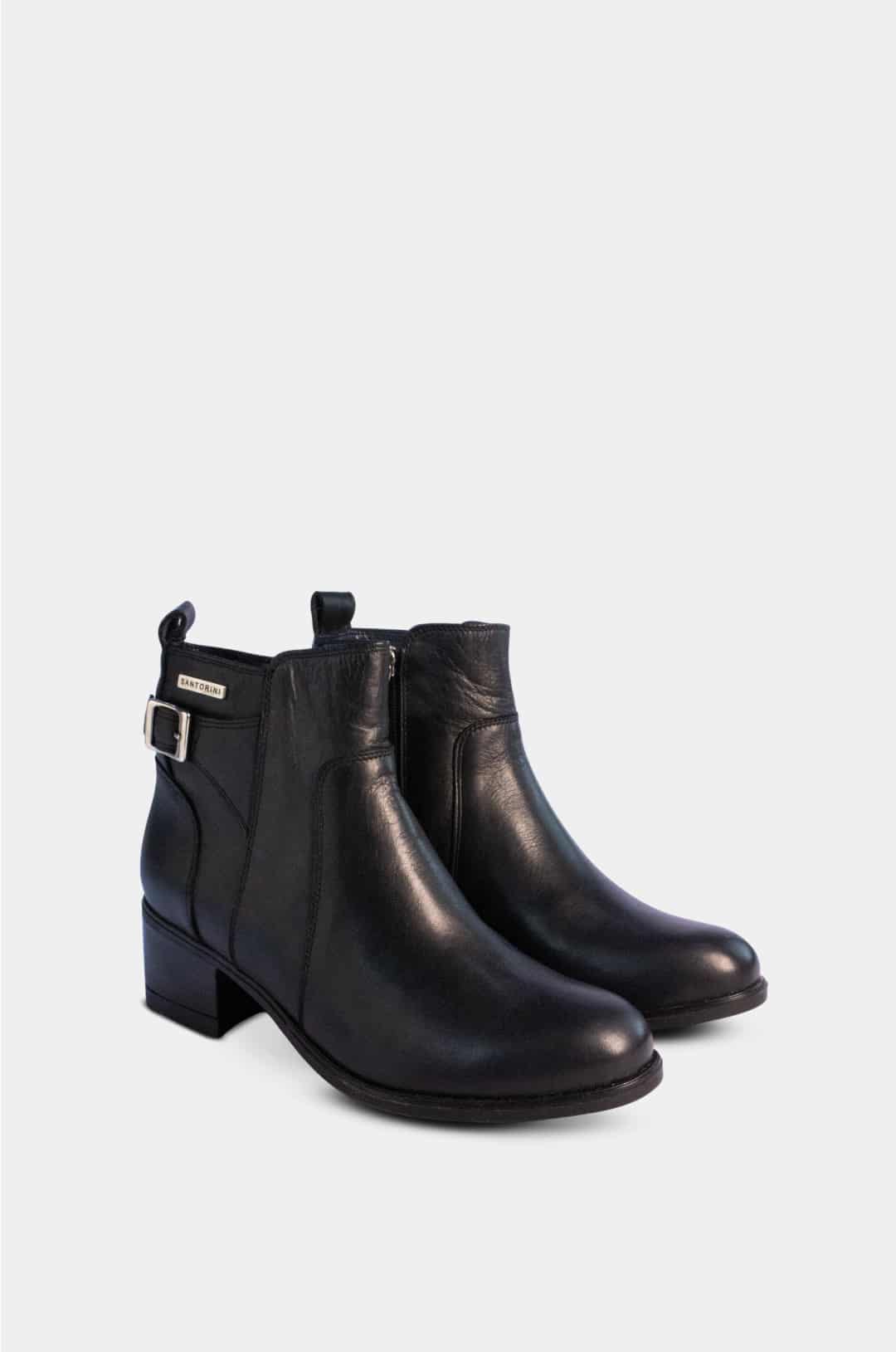 El botín de la marca Santoini está elaborado en cuero de alta calidad, ofreciendo un acabado elegante y resistente. Presenta una punta  semi redonda, que brinda mayor comodidad y un estilo clásico ideal para el uso diario.