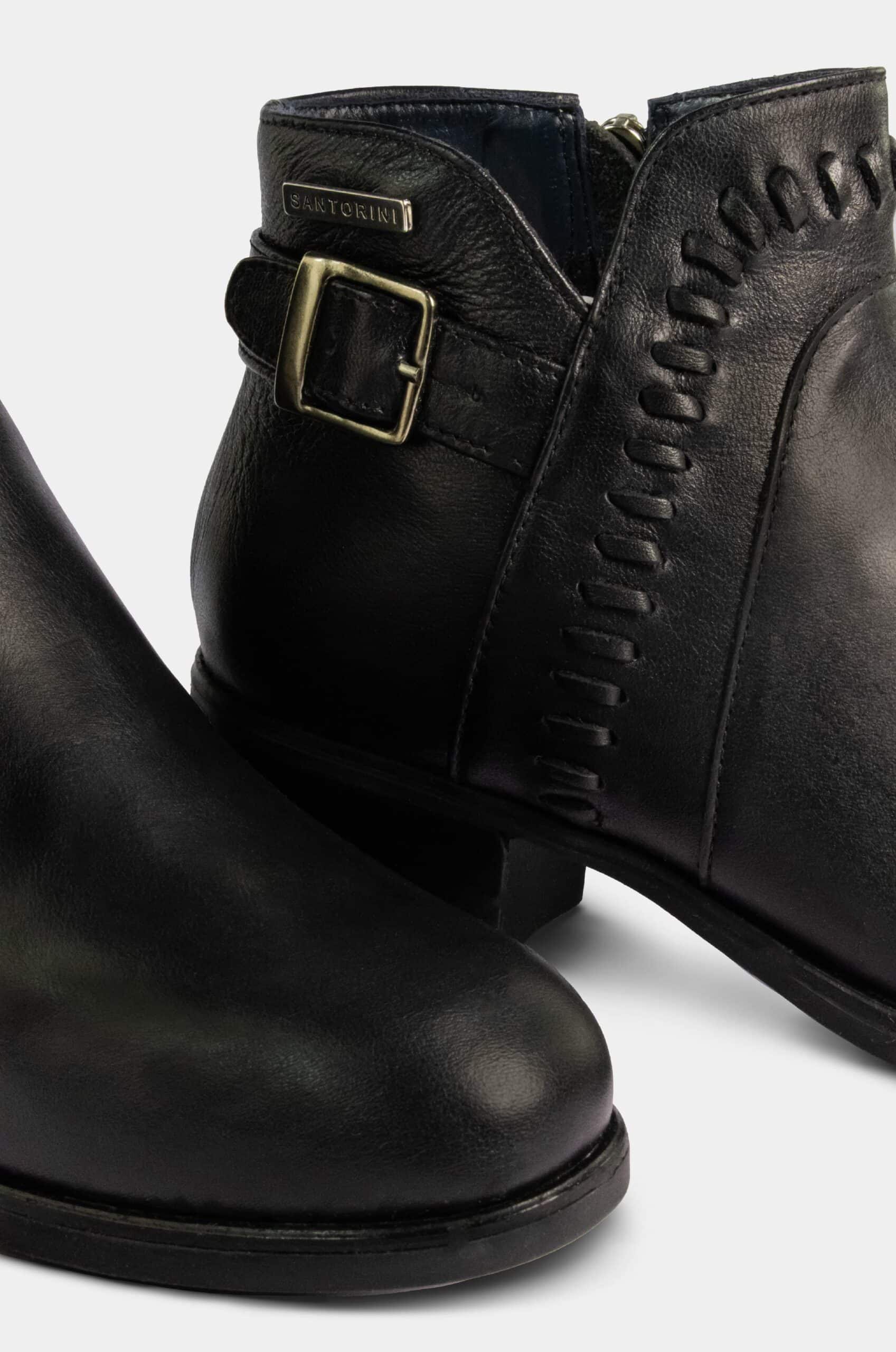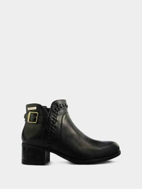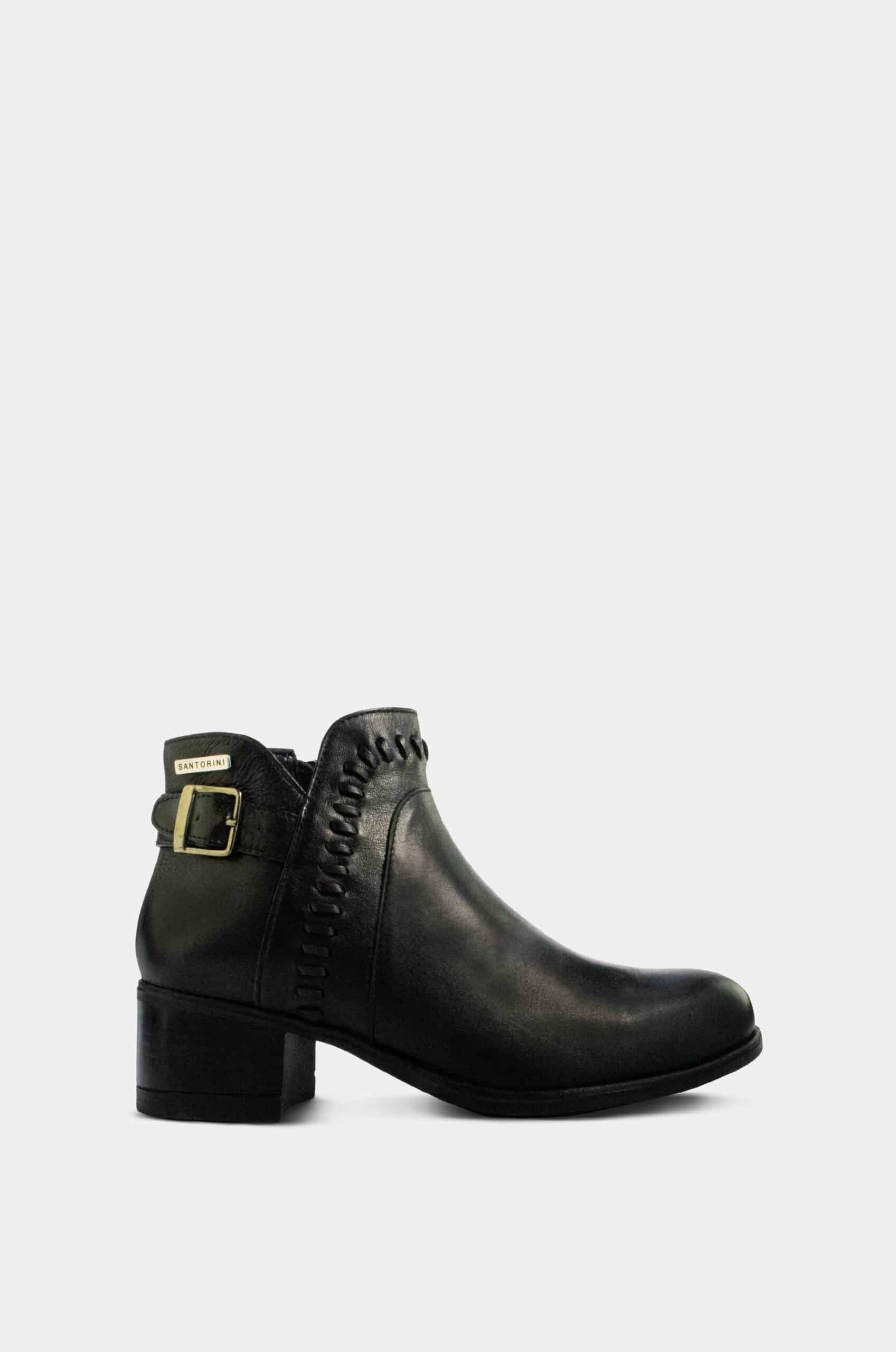 Está elaborado en cuero negro de acabado liso, suave y resistente. Presenta punta redondeada, que aporta comodidad y un look atemporal. En el lateral externo se destaca un detalle de costura tipo trenzado, que añade un toque artesanal y diferenciador al diseño. Incorpora además una correa decorativa con hebilla metálica en la parte posterior de la caña, aportando carácter y sofisticación.