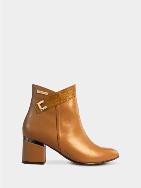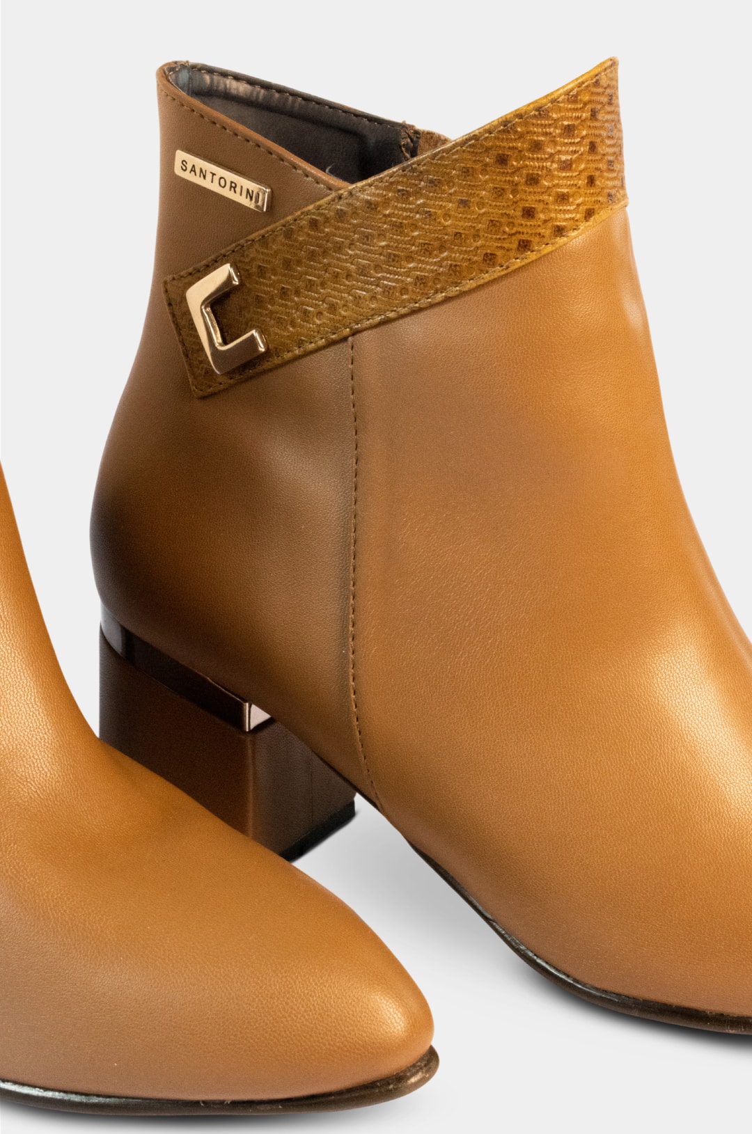 Botín color miel de la marca Santorini, elaborado en material sintético de alta calidad con una apariencia suave y uniforme que imita muy bien al cuero real. El tono miel le da un aire cálido, versátil y elegante, ideal para combinar con múltiples estilos.
