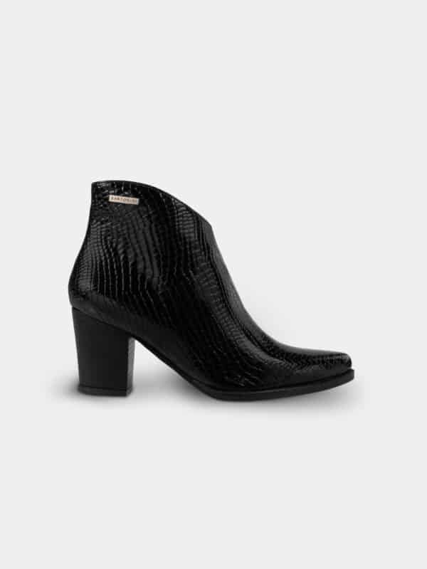 Botín marca SANTORINI elaborado en material sintético con elegante acabado tipo reptil que aporta textura y brillo sofisticado. Su diseño de líneas limpias y silueta estilizada lo convierte en una pieza versátil y moderna.