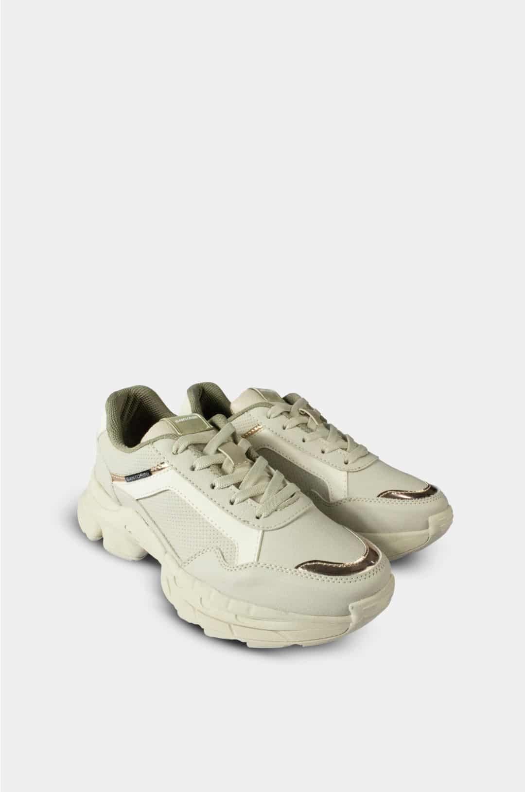 Tenis marca Santorini elaborado en material sintético de alta calidad, en tono beige claro que aporta un estilo versátil y moderno. Su diseño presenta detalles perforados laterales que favorecen la transpiración y sutiles apliques metálicos en tono dorado que le dan un toque elegante y femenino.