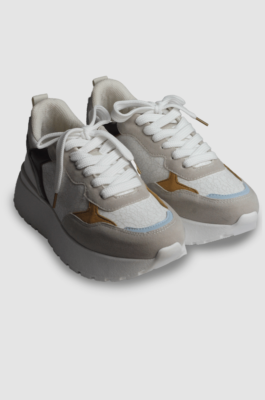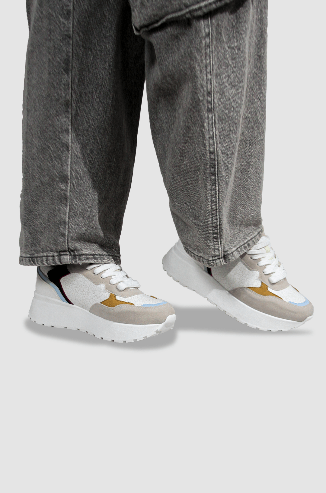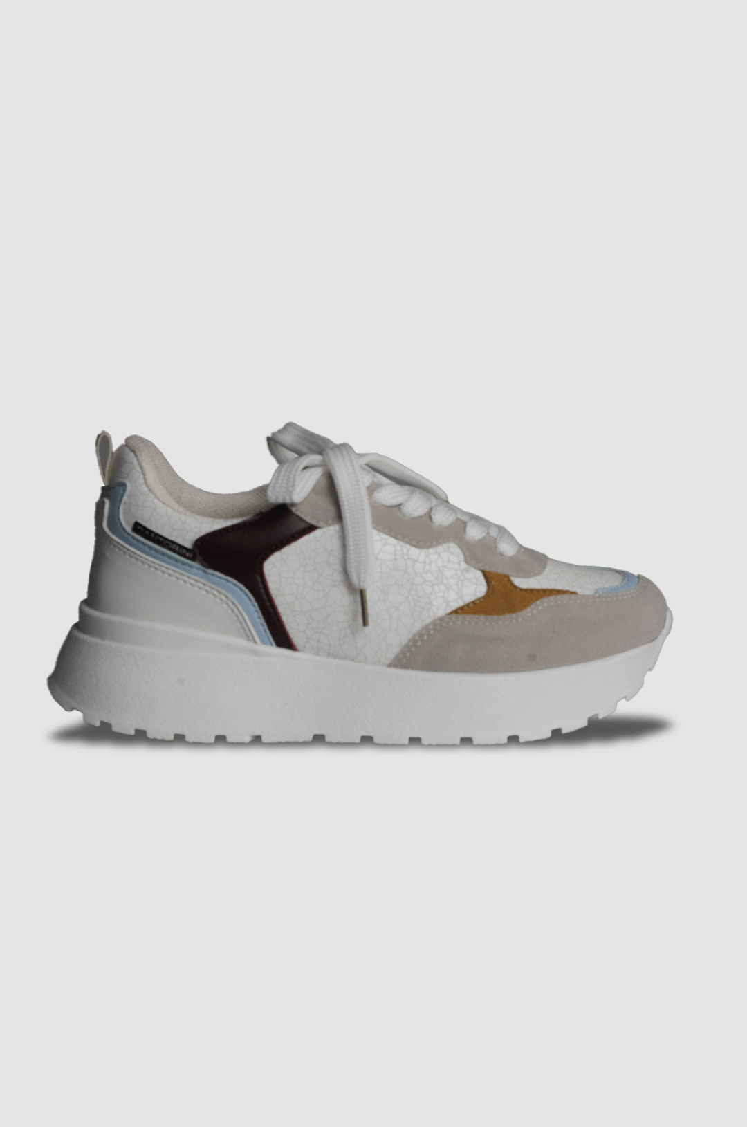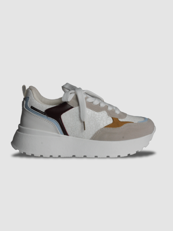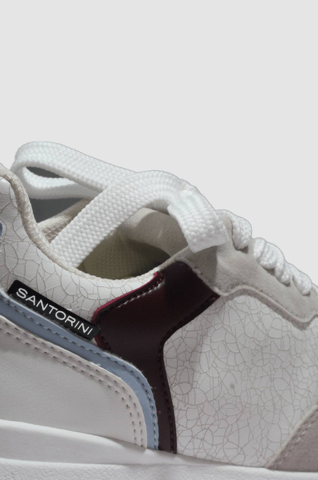 Tenis para dama de la marca SANTORINI, con diseño moderno y versátil. Fabricados en material sintético de alta calidad, combinan tonos blanco, beige, mostaza, azul y vino, creando un contraste atractivo y actual. Su suela chunky en color blanco aporta un estilo urbano y brinda mayor comodidad al caminar. Incluyen cierre con cordones para un ajuste perfecto y detalles en relieve que realzan su diseño contemporáneo, ideales para looks casuales y de moda.