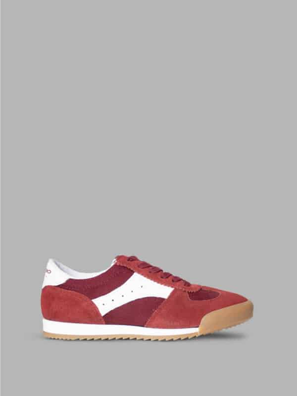 Bottero presenta un diseño urbano y deportivo en cuero, ideal para un estilo casual con un toque retro. Su capellada combina cuero gamuzado color vino tinto con detalles en material textil que aportan frescura y comodidad. Incorpora una franja lateral blanca con perforaciones decorativas que resaltan el contraste de color. La puntera reforzada y la suela en tono caramelo brindan resistencia y tracción, mientras que el forro interno suave y la plantilla acolchada aseguran confort durante todo el día.