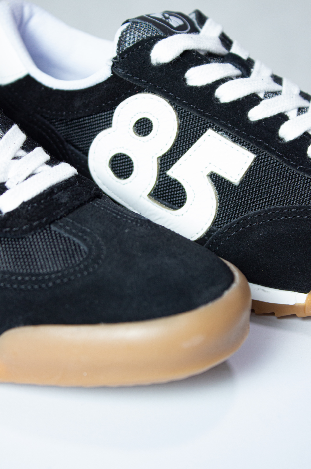 Este tenis en cuero negro marca BOTTERO combina estilo deportivo con un aire retro. Está confeccionado en cuero gamuzado de tono negro, reforzado con paneles en malla que aportan frescura y ligereza. En el lateral resalta el número 85 en color blanco, un detalle que le da carácter juvenil y auténtico.