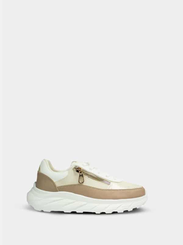 Tenis para mujer marca Santorini en tono beige, diseñado para ofrecer comodidad y estilo en un mismo modelo. Fabricado en material suave y resistente, su silueta moderna se complementa con una suela blanca de 3.5 cm de altura, que aporta mayor confort y una ligera elevación sin perder estabilidad.
