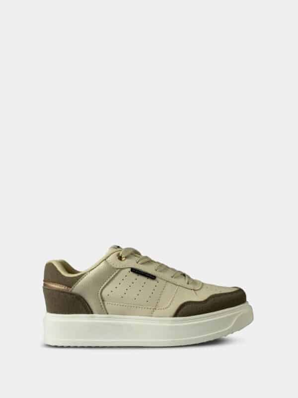 Descubre el equilibrio perfecto entre diseño moderno, confort y versatilidad con estos tennis para mujer en tono arena. Su acabado en material sintético con detalles texturizados y suela gruesa brindan un look urbano y contemporáneo, ideal para acompañarte en la rutina diaria con ligereza y soporte en cada paso.