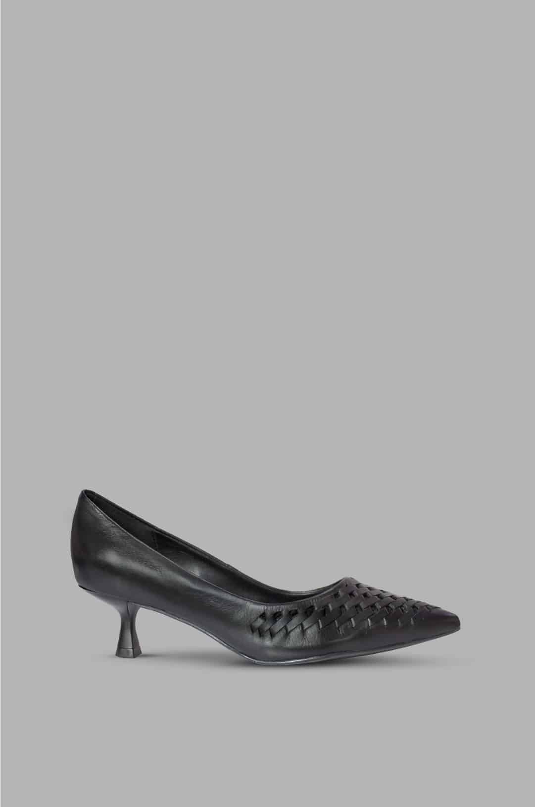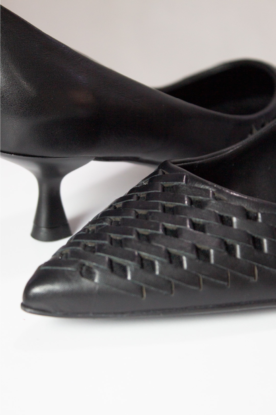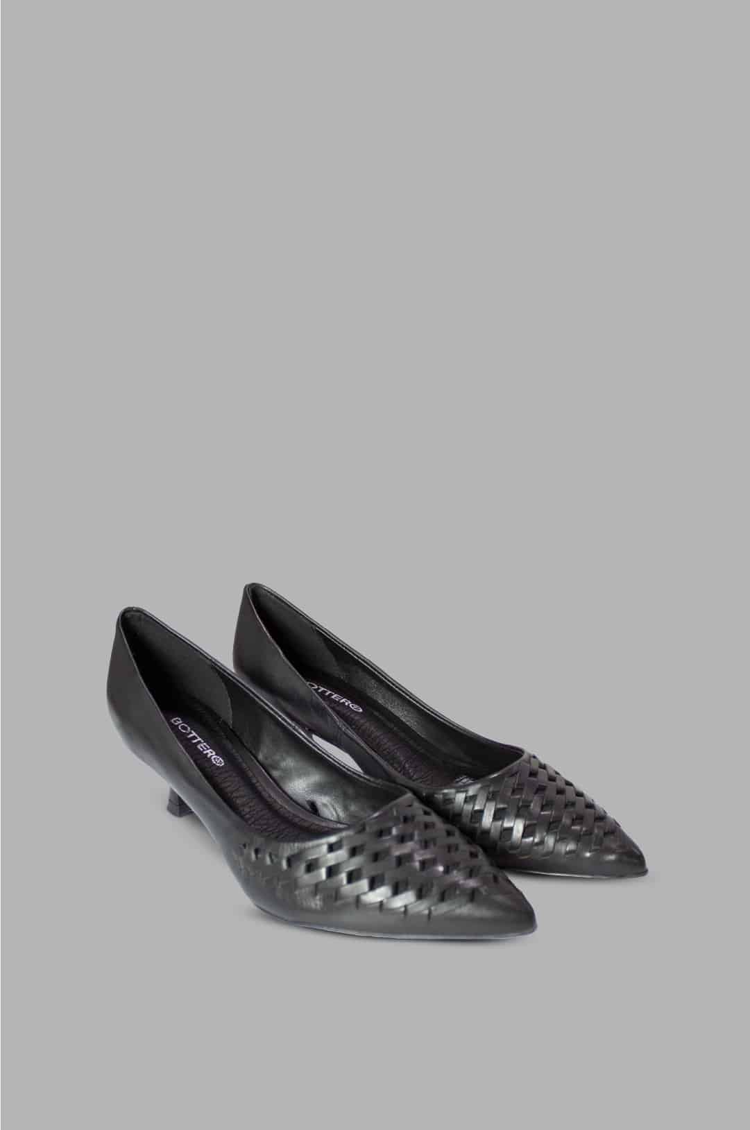 Este zapato de Bottero en cuero negro combina elegancia y sofisticación con un diseño clásico y femenino. Su capellada en cuero natural trenzado en la parte frontal aporta un toque artesanal y distintivo, mientras que el acabado liso en la parte trasera realza su estilo refinado. Presenta una punta fina que estiliza el pie y un tacón bajo tipo kitten de aproximadamente 3.5 cm de altura, ideal para brindar comodidad y estabilidad sin perder elegancia.