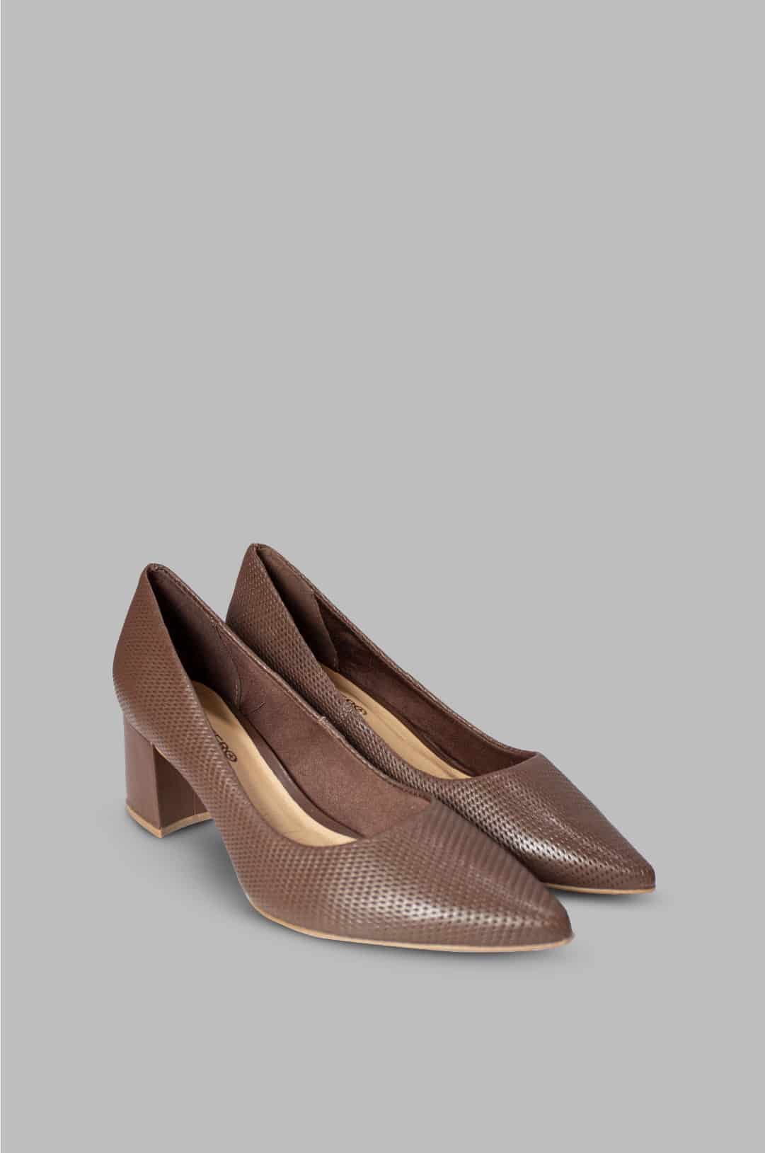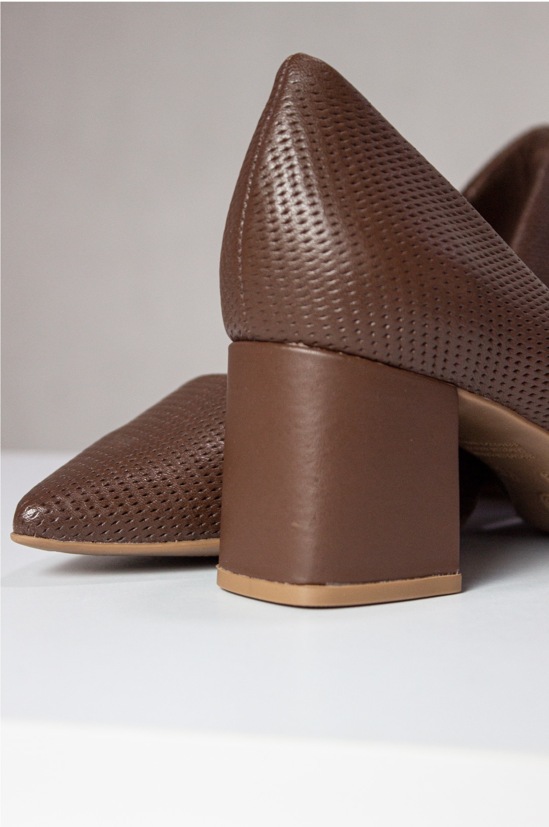 Este zapato marca Bottero está confeccionado en cuero texturizado con un delicado patrón que aporta un toque moderno y sofisticado. Su diseño tipo pump con punta fina estiliza el pie, mientras que el tacón cuadrado de altura media brinda estabilidad y comodidad al caminar. De color marrón, es una pieza versátil que combina elegancia y confort, ideal para ocasiones formales o de oficina. Su plantilla suave y forro interno acolchado reflejan la calidad y el cuidado característicos de la marca Bottero.
