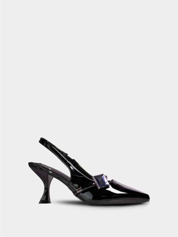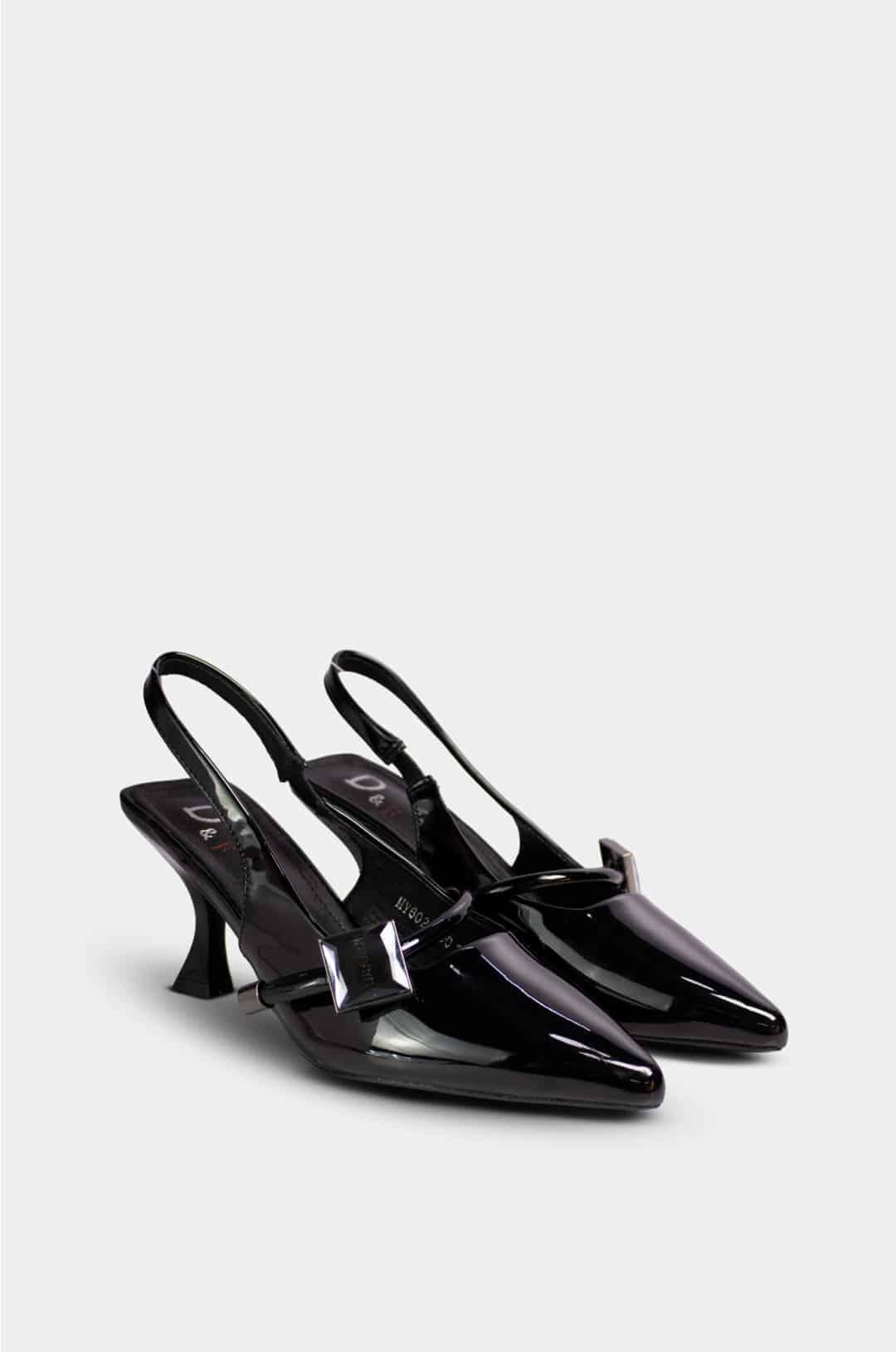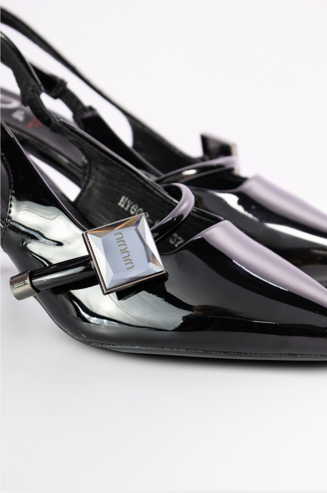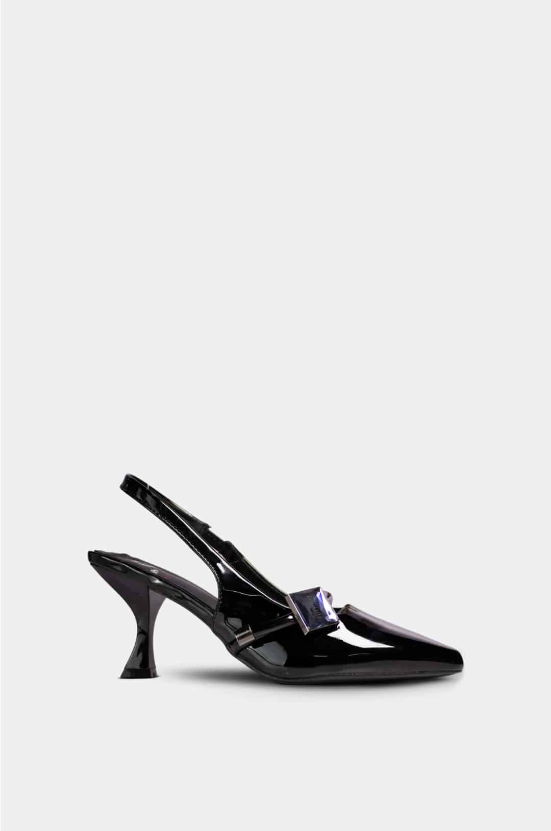 Este modelo es un zapato tipo slingback de diseño elegante y moderno, elaborado en material charol negro de alto brillo. Cuenta con una punta fina que estiliza el pie y aporta un toque sofisticado. En el empeine destaca un adorno cuadrado tipo hebilla metálica, que añade un detalle distintivo y llamativo al diseño.