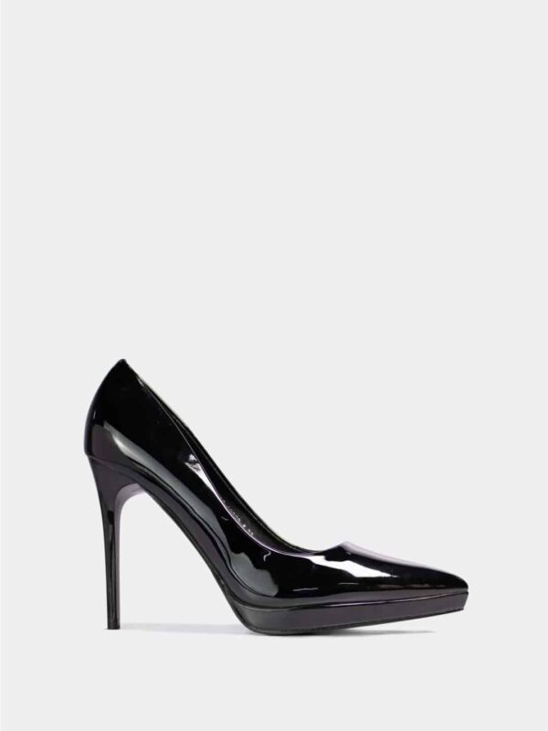 La plataforma delantera es delgada y sutil, lo que ayuda a equilibrar la altura del tacón y brinda mayor comodidad al caminar. El tacón es un stiletto alto, aproximadamente de 8.5 cm, estilizado y delgado, aportando una apariencia más alargada y femenina a la silueta del calzado.