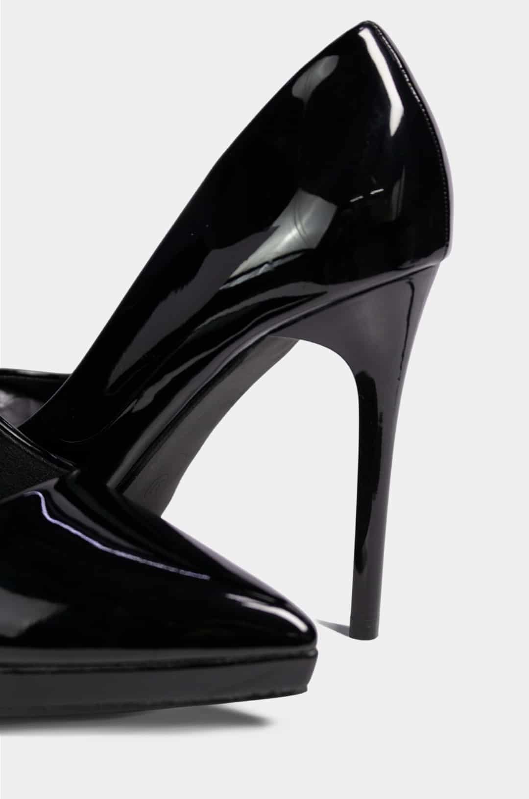 La plataforma delantera es delgada y sutil, lo que ayuda a equilibrar la altura del tacón y brinda mayor comodidad al caminar. El tacón es un stiletto alto, aproximadamente de 8.5 cm, estilizado y delgado, aportando una apariencia más alargada y femenina a la silueta del calzado.