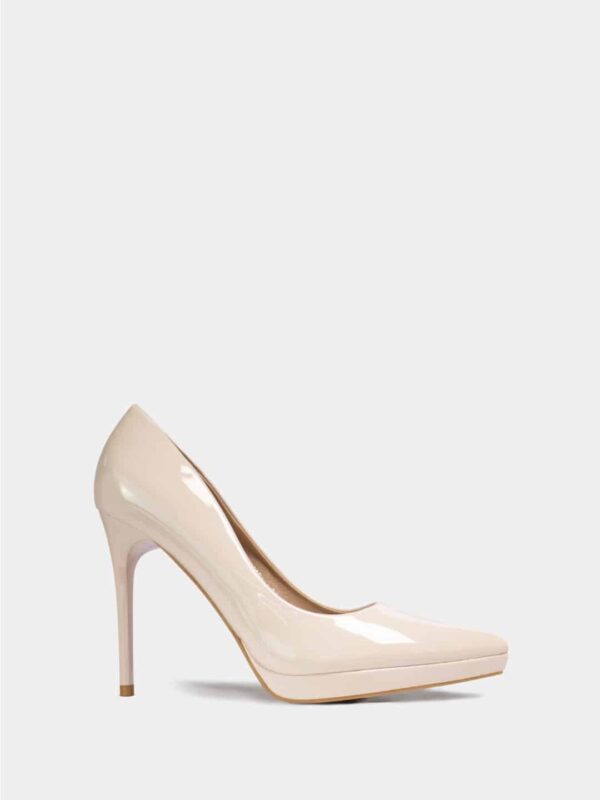 La plataforma delantera es delgada y sutil, lo que ayuda a equilibrar la altura del tacón y brinda mayor comodidad al caminar. El tacón es un stiletto alto, aproximadamente de 8.5 cm, estilizado y delgado, aportando una apariencia más alargada y femenina a la silueta del calzado.