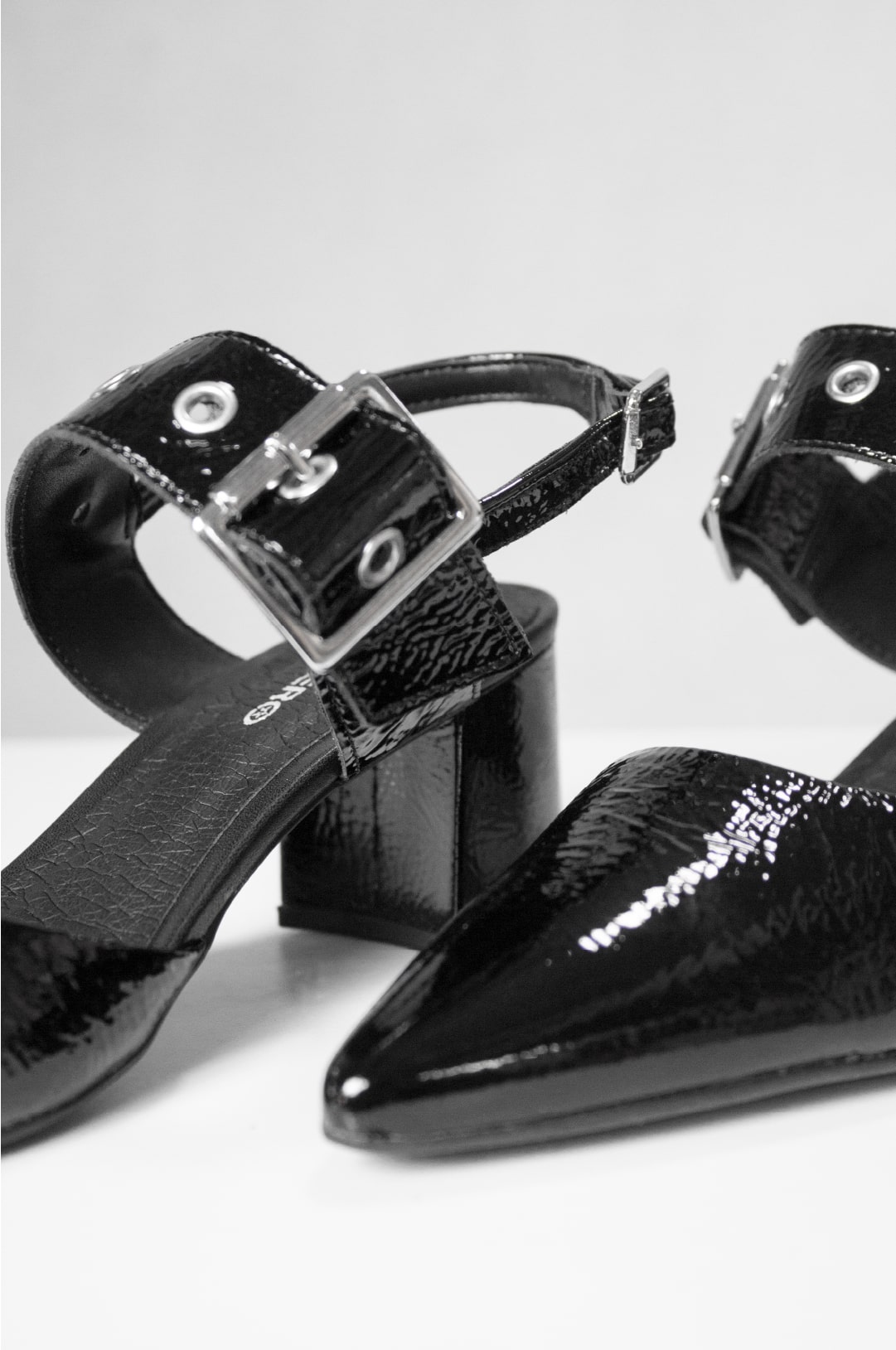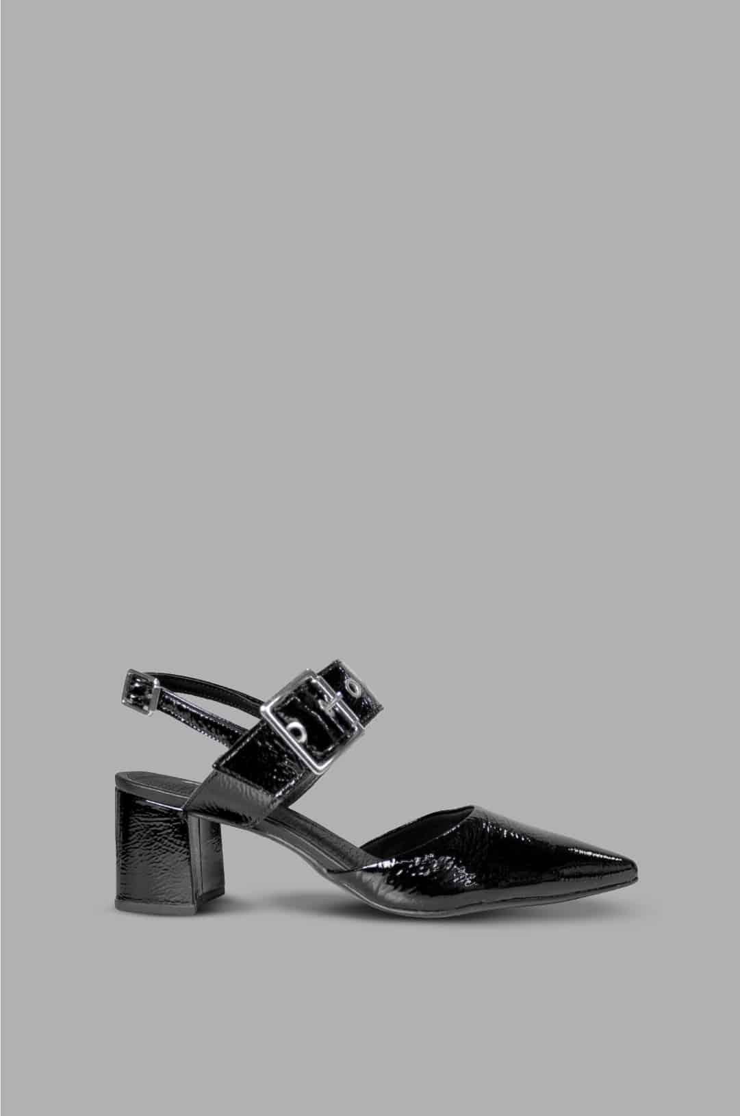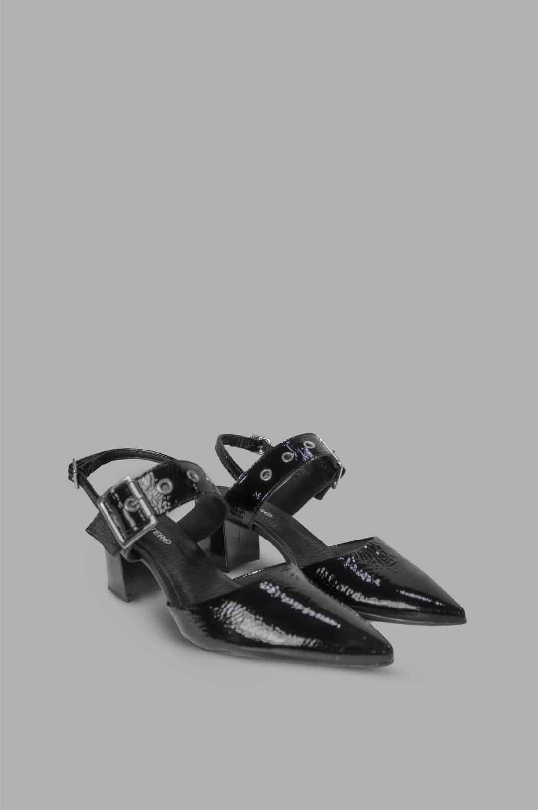Zapato en cuero negro marca Bottero con tacón ancho de 6.5 cm, que ofrece estabilidad y comodidad al caminar. Su diseño presenta un empeine abierto, aportando un toque moderno y elegante, mientras que la punta cerrada mantiene un estilo clásico y sofisticado. Ideal para ocasiones formales o de oficina, combina a la perfección elegancia y confort gracias a su acabado en cuero suave y su estructura que estiliza la figura sin sacrificar comodidad.