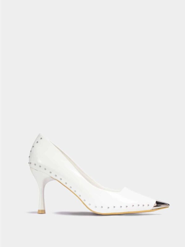 Tacón marca Santorini, elaborado en material sintético de acabado brillante en color blanco. Su diseño es clásico y elegante, con punta fina metálica en tono plateado que aporta un detalle moderno y llamativo.