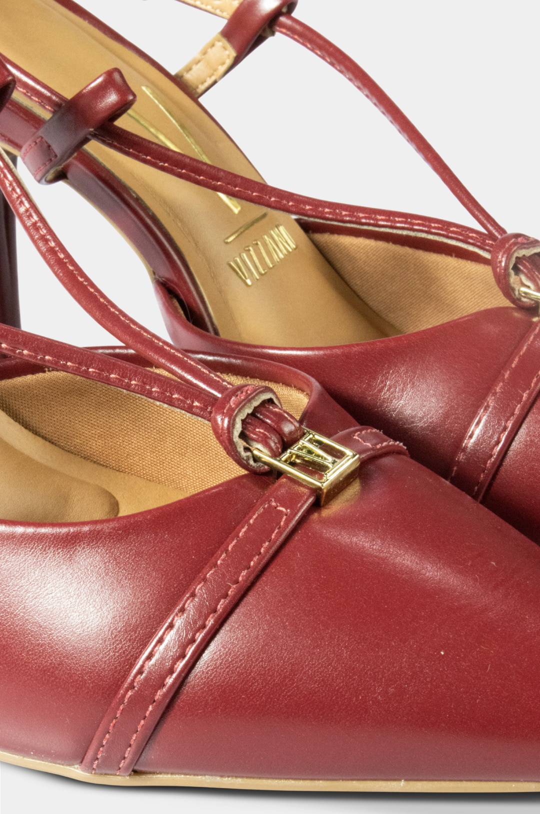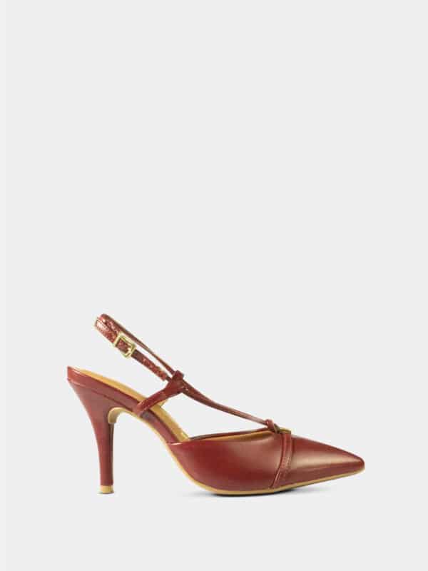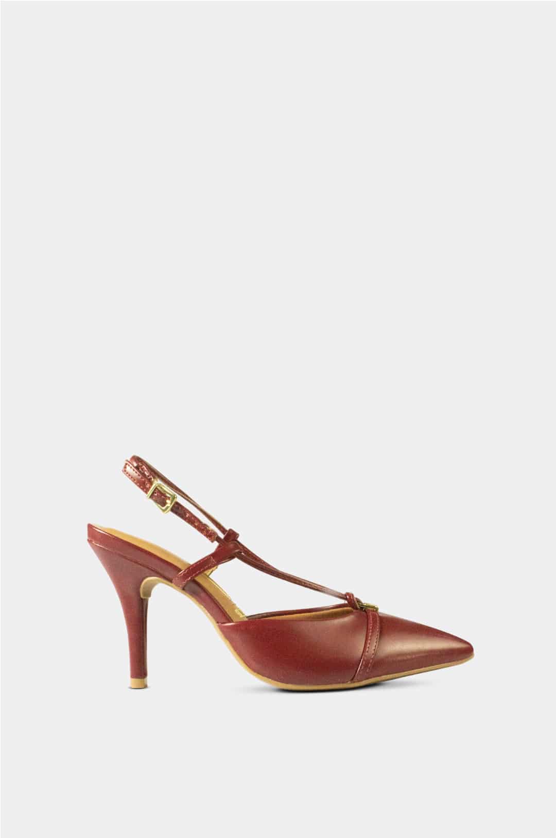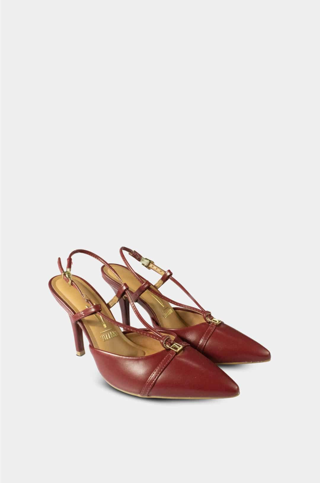 Presenta diseño de punta fina que estiliza la silueta del pie, acompañado de una delicada correa delgada tipo “T” sobre el empeine que se une a una pulsera ajustable al tobillo con hebilla metálica dorada, brindando mejor sujeción y un detalle femenino. Incorpora pequeños acabados metálicos que realzan su diseño moderno.