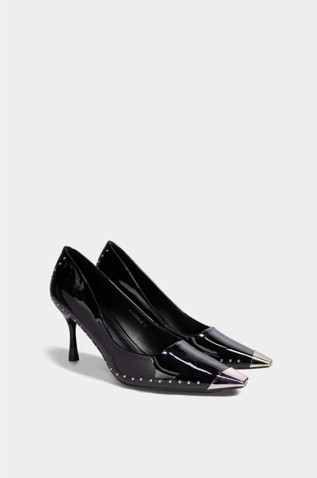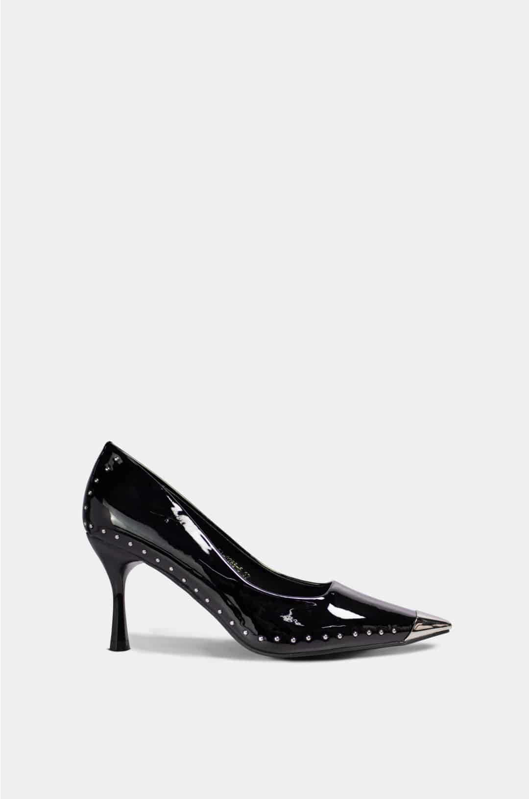 El tacón es delgado y de altura media, ideal para lucir elegante sin perder comodidad. A lo largo del contorno del zapato se observan pequeños taches metálicos decorativos, que le dan un toque vanguardista y llamativo. La punta cuenta con un aplique metálico plateado, que realza aún más el diseño y aporta un acabado distintivo.