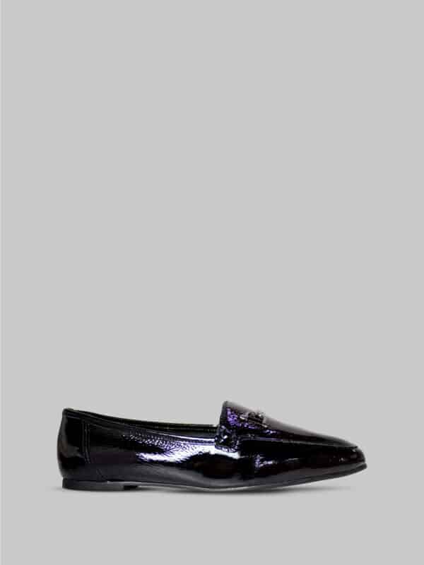 Este zapato marca Bottero está elaborado en cuero negro charolado, lo que le aporta un acabado brillante y elegante. Su diseño es tipo mocasín, con punta ligeramente alargada y detalles de herraje metálico en el empeine, que le dan un toque sofisticado y moderno.