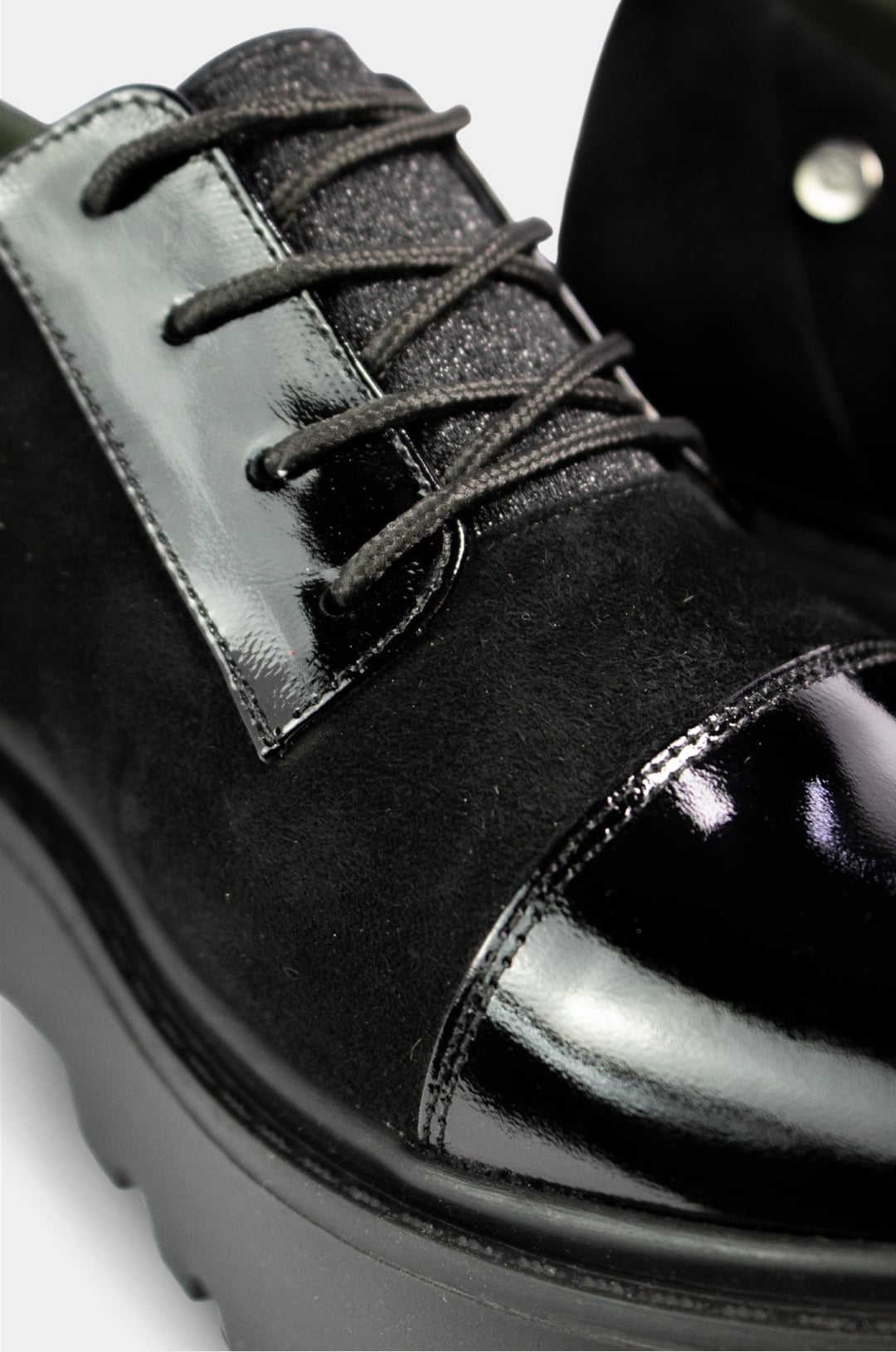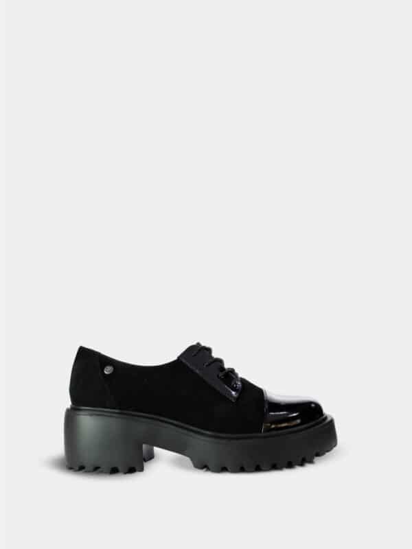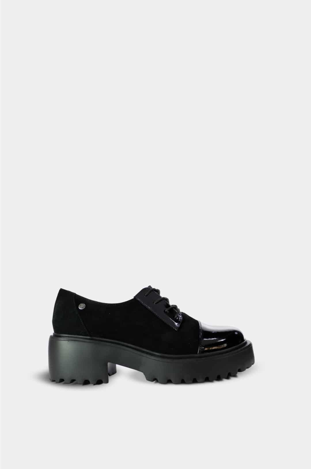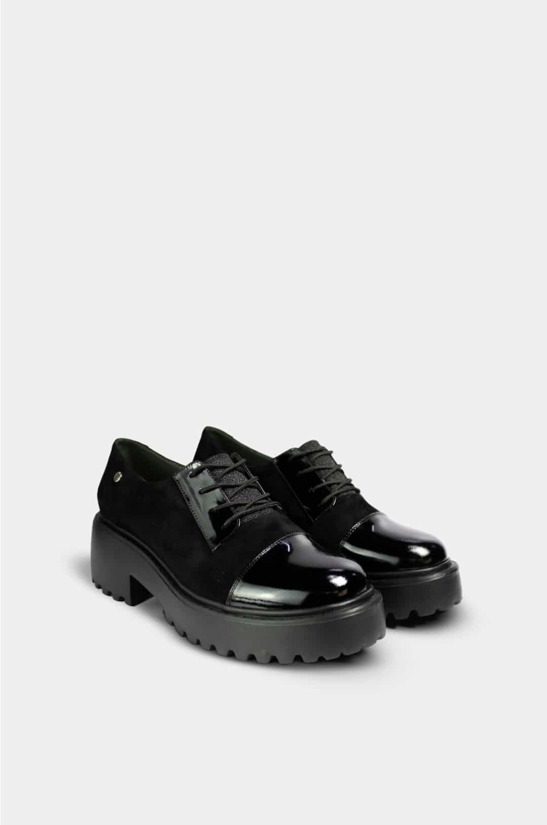 Un zapato en color negro marca Santorini que combina charol brillante en la punta con carnaza en el resto de la capellada, creando un contraste elegante y moderno. Cuenta con una suela ancha de estilo robusto que aporta comodidad y un look contemporáneo, además de cordones frontales que brindan buen ajuste y un toque clásico. Es una pieza versátil ideal para un estilo formal con un toque urbano.