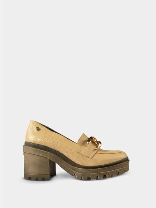 Este zapato tipo mocasín marca Santorini está elaborado en material sintético con acabado graneado, que le aporta un look elegante y contemporáneo. Su diseño cerrado presenta una punta redonda y un aplique decorativo metálico en el empeine, que añade un toque sofisticado y moderno.